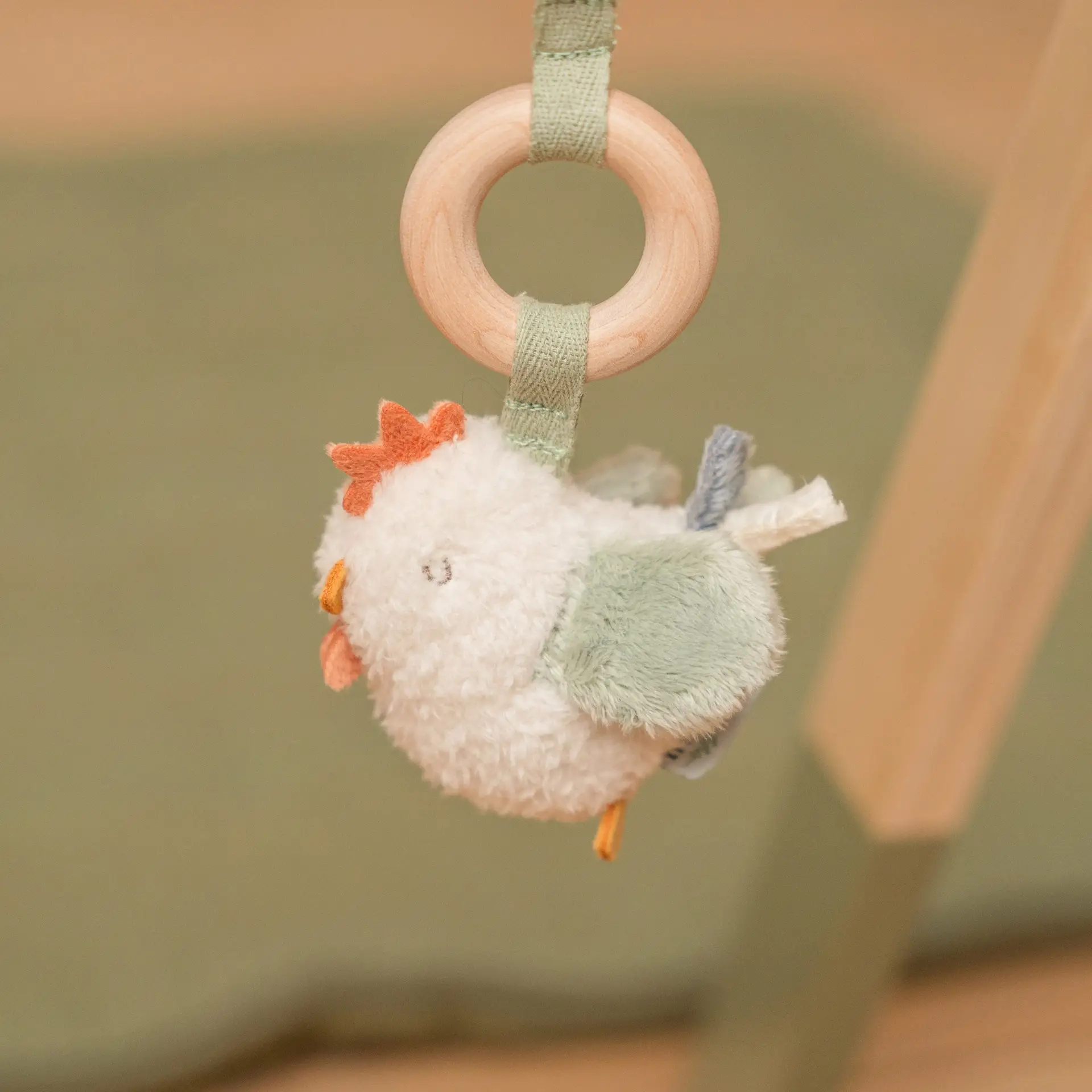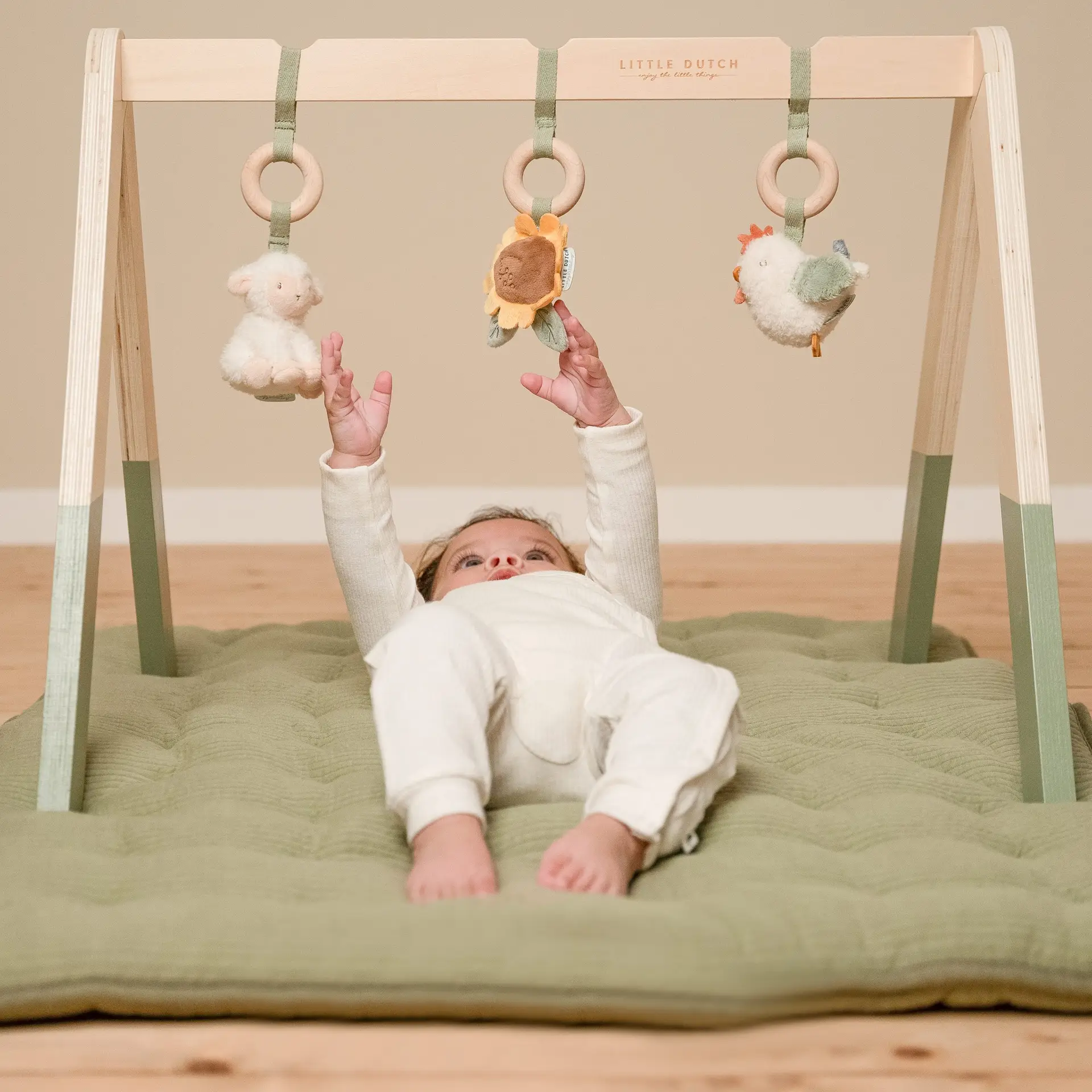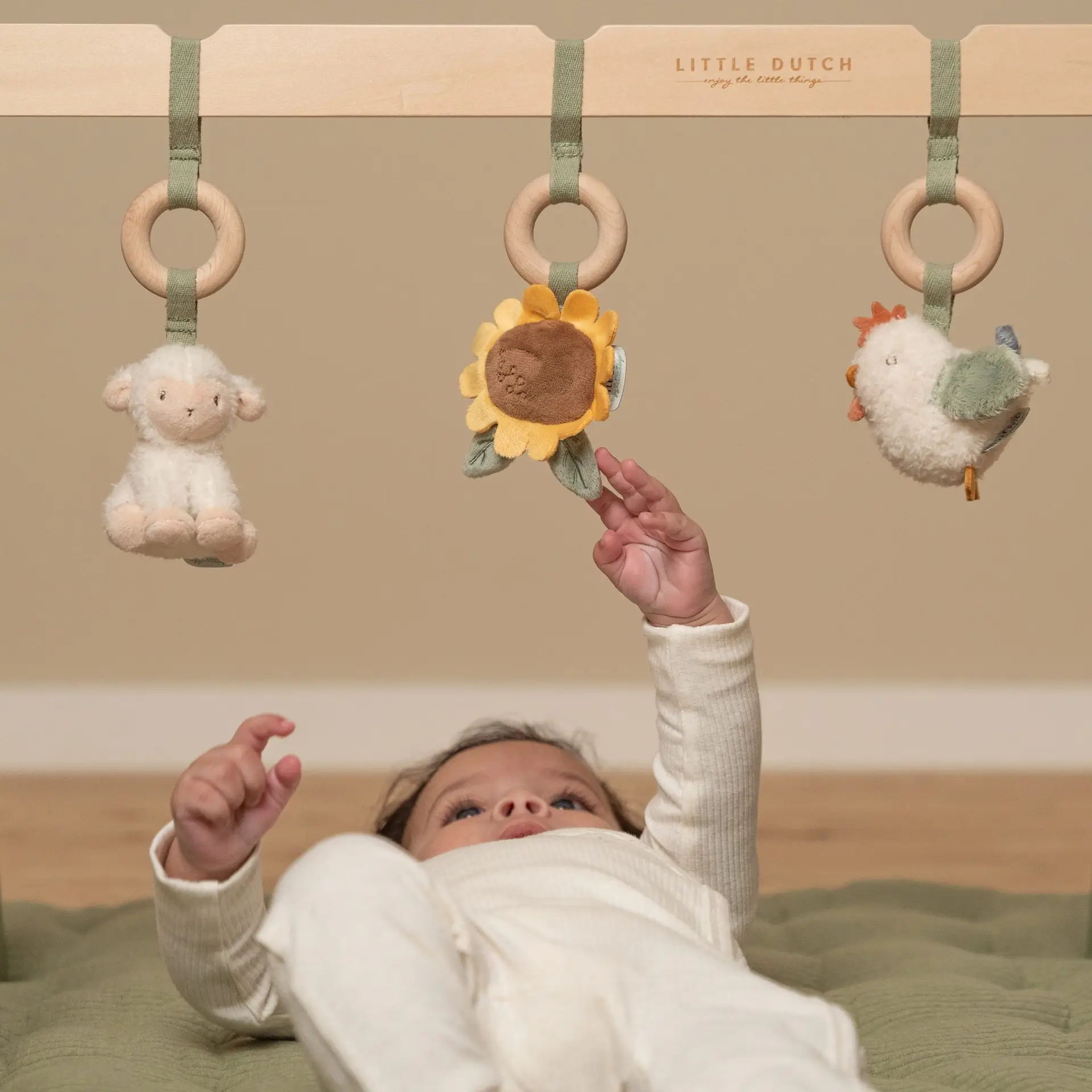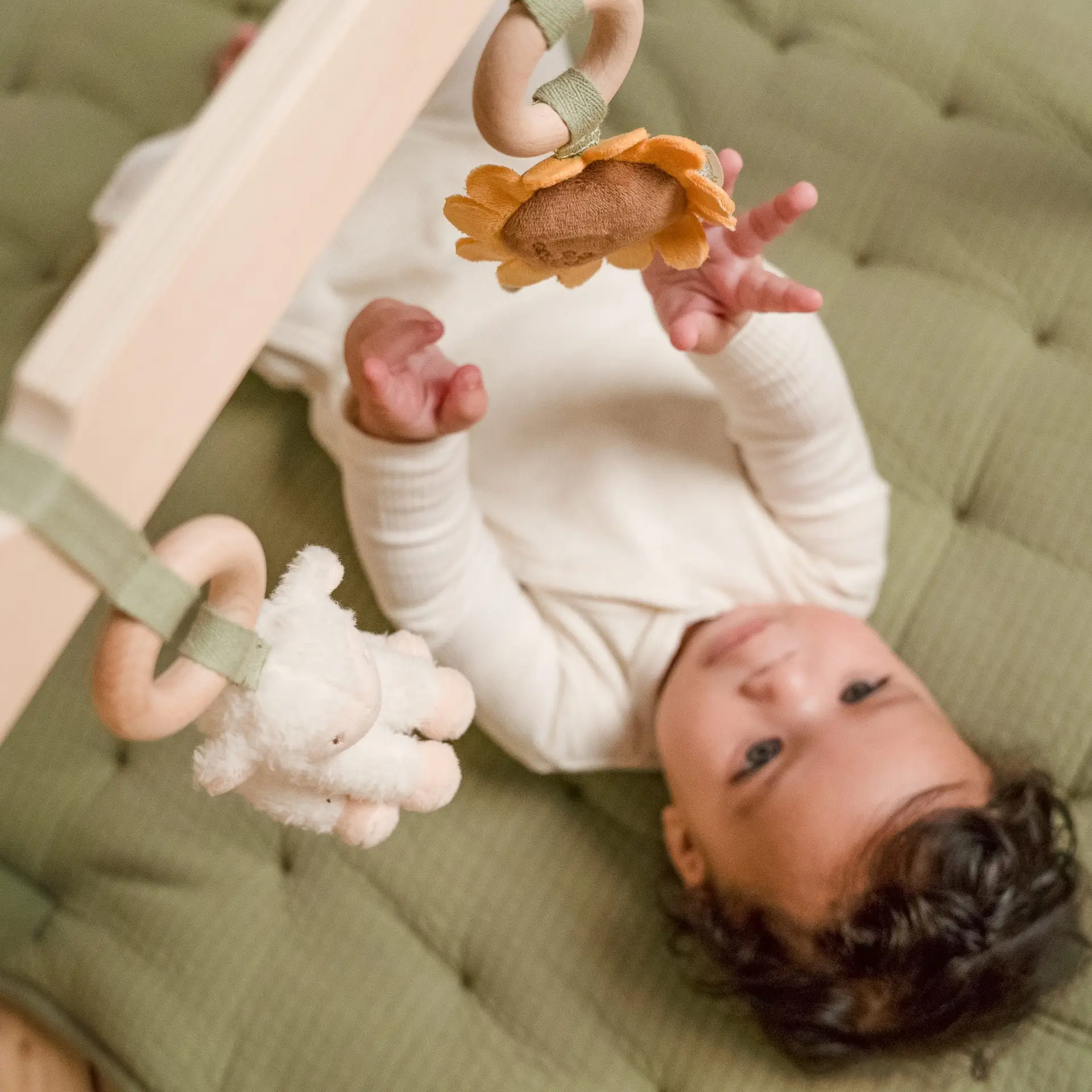 Este gimnasio tiene tres bonitos juguetes, con diferentes texturas y actividades, que animan a los bebés a tocarlos y explorarlos.