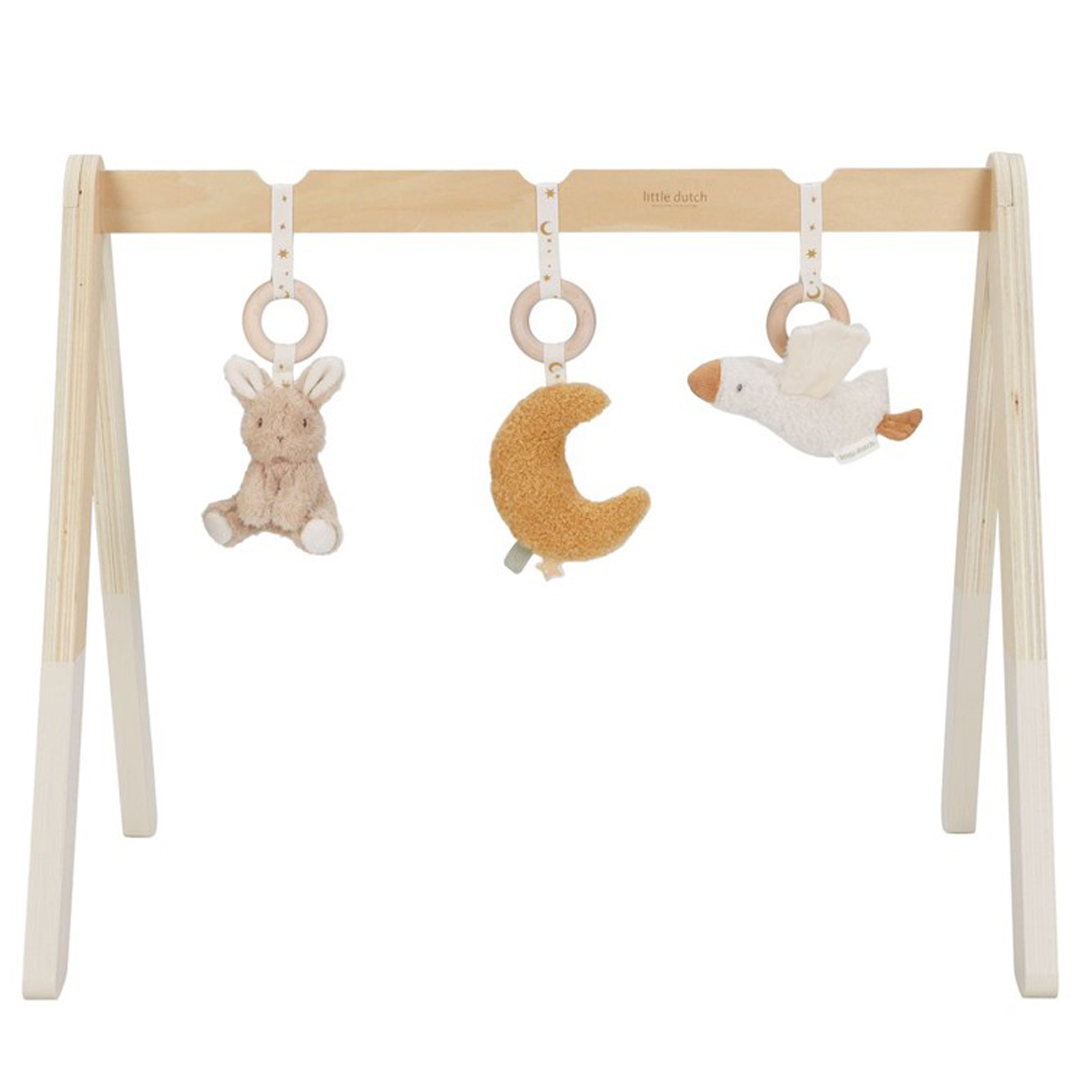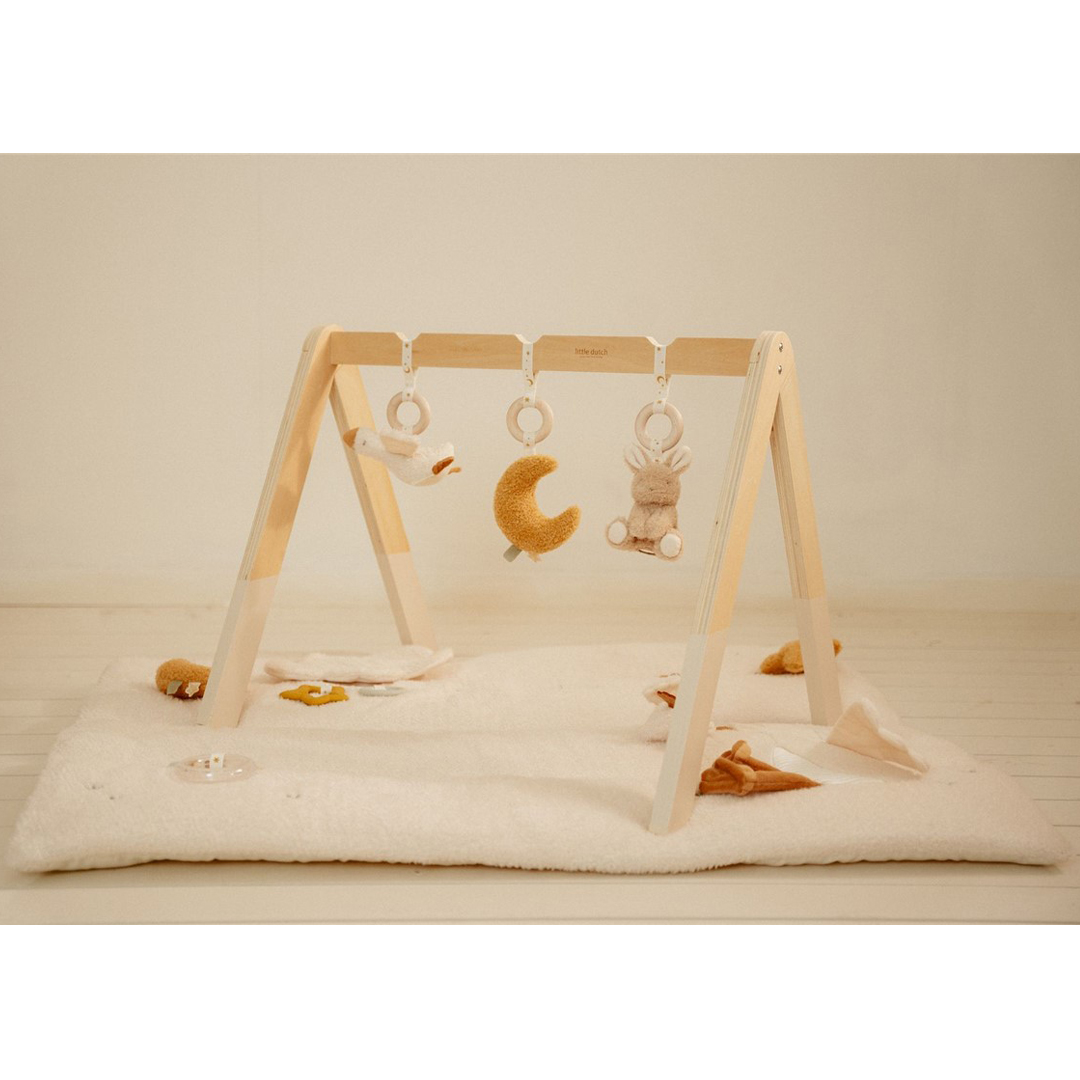 Este gimnasio tiene tres bonitos juguetes, con diferentes texturas y actividades, que animan a los bebés a tocarlos y explorarlos.