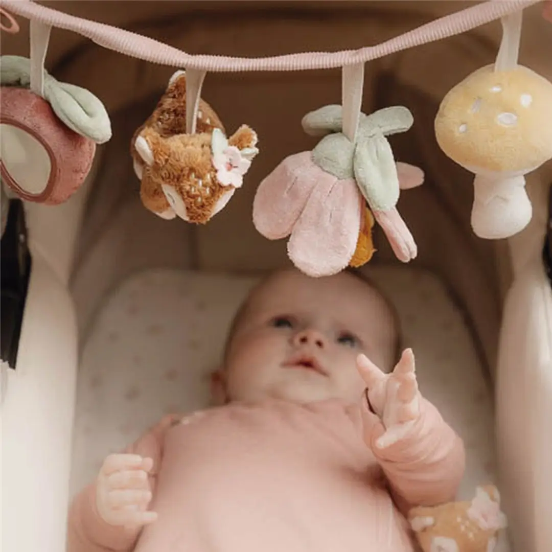 Esta cadena de juguetes es muy fácil de colocar en un cochecito o en una sillita de coche y proporciona mucho entretenimiento al bebé gracias a los divertidos juguetes: un espejo, un sonajero, un juguete crujiente y un juguete que chilla si lo aprietas. También estimula los sentidos y la coordinación mano-ojo.