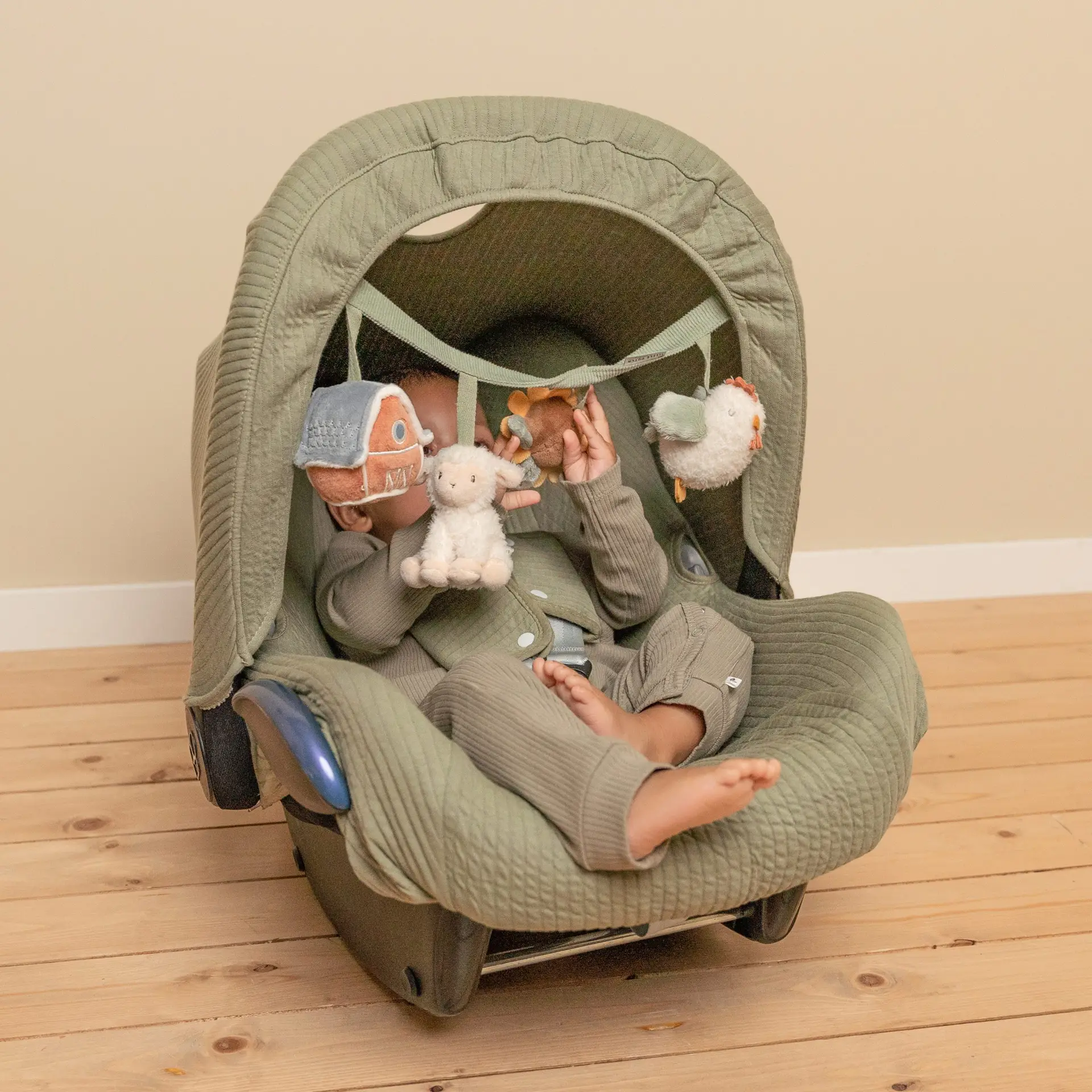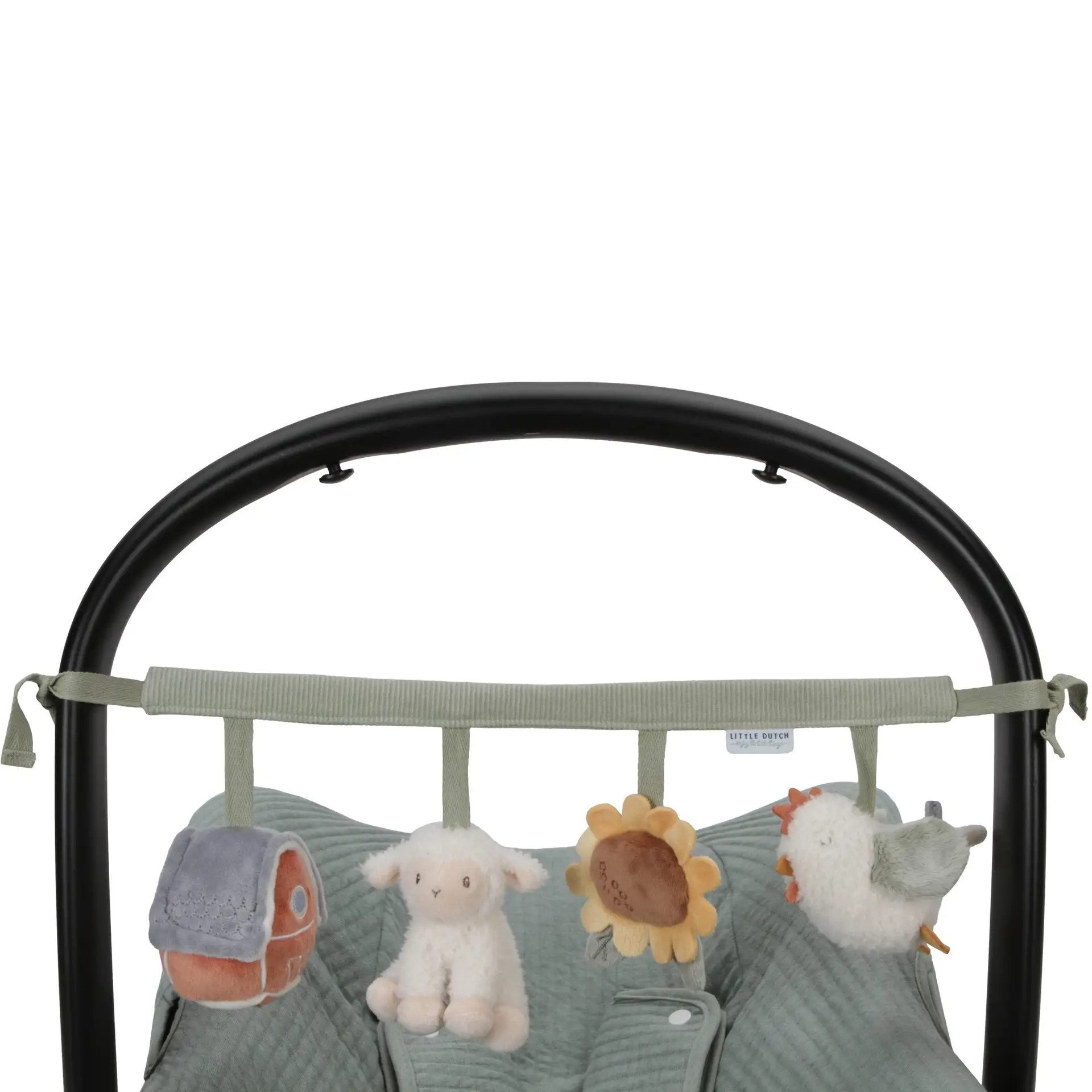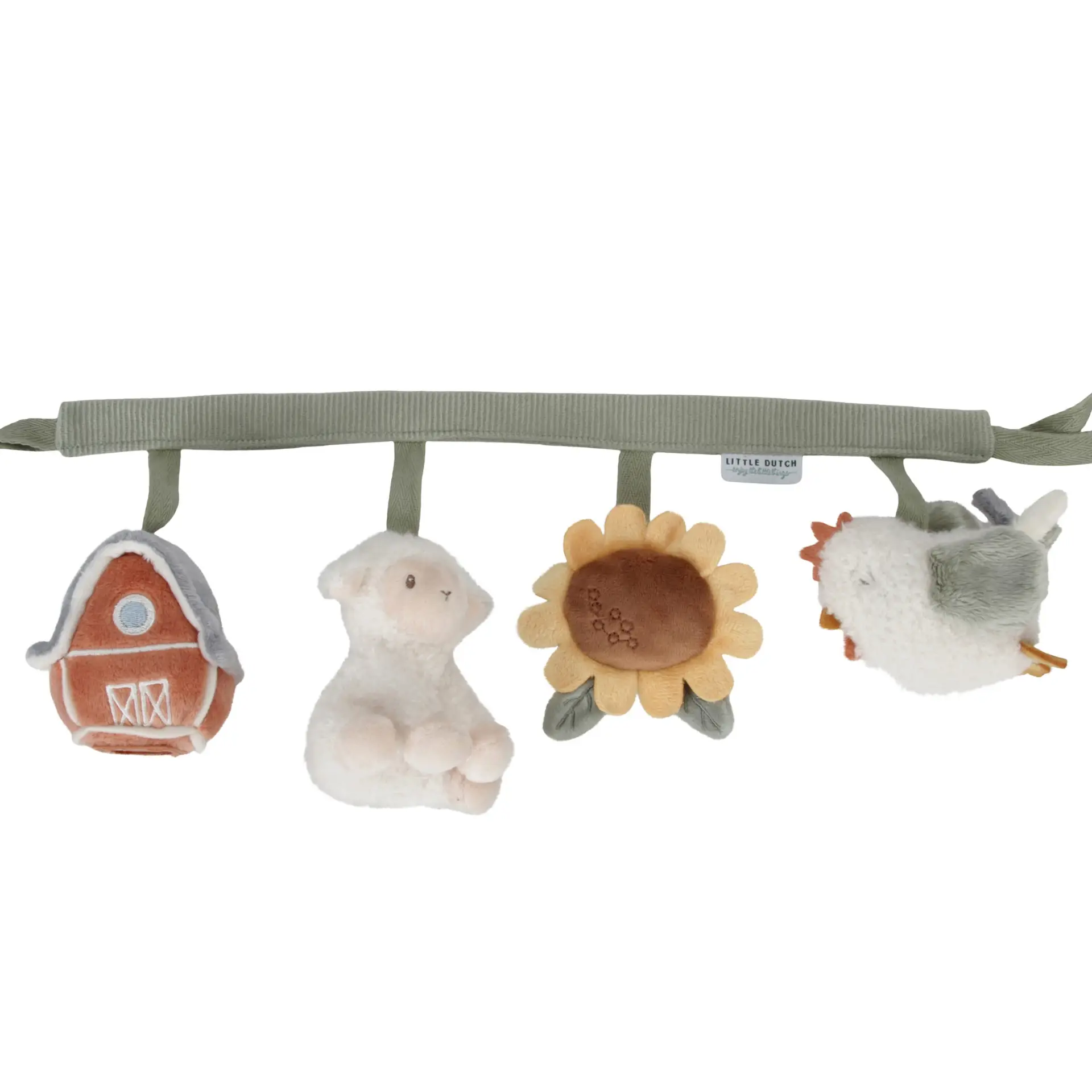 Esta cadena de juguetes es muy fácil de colocar en un cochecito o en una sillita de coche y proporciona mucho entretenimiento al bebé gracias a los divertidos juguetes: un granero con espejo, una ovejita sonajero, un girasol crujiente y una gallina que chilla si la aprietas. También estimula los sentidos y la coordinación mano-ojo.