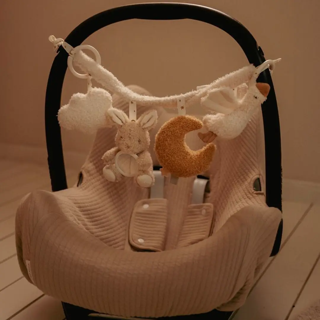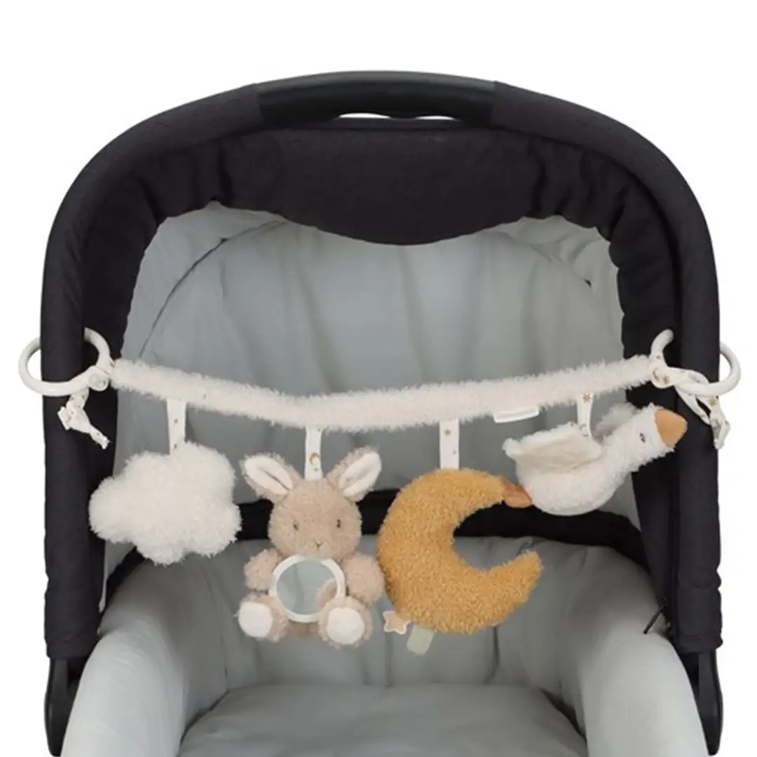 Esta cadena de juguetes es muy fácil de colocar en un cochecito o en una sillita de coche y proporciona mucho entretenimiento al bebé gracias a los divertidos juguetes: un espejo, un sonajero, un juguete crujiente y un juguete que chilla si lo aprietas. También estimula los sentidos y la coordinación mano-ojo.