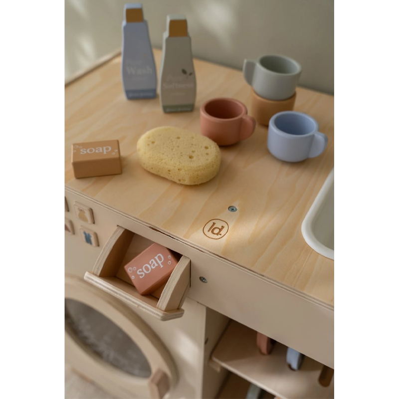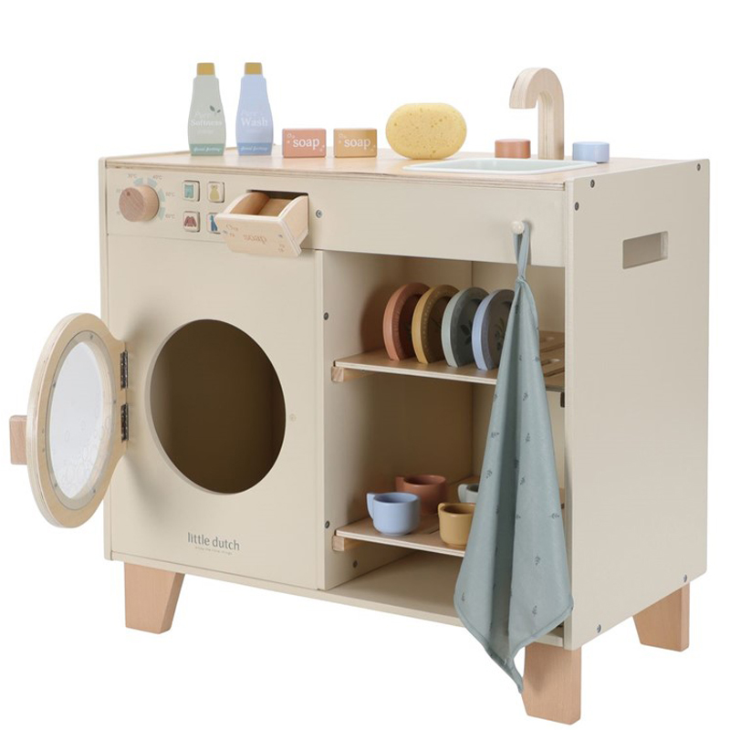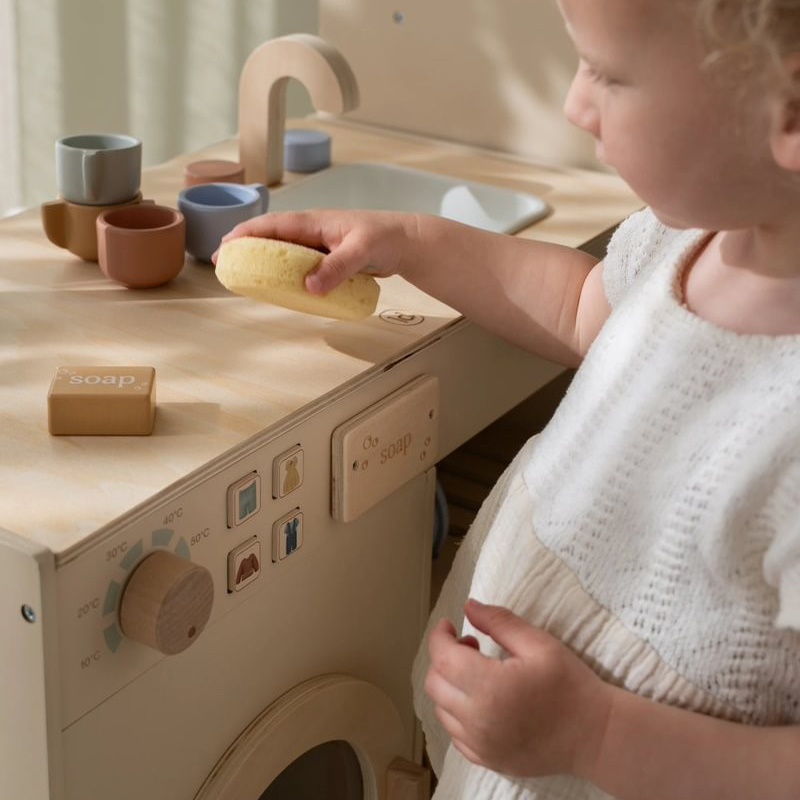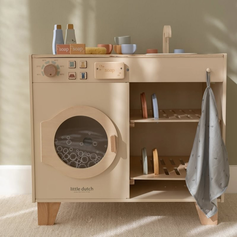 Con esta lavadora y fregadero de madera, las tareas del hogar se convierten en una auténtica aventura. El set incluye cuatro tazas, cuatro platos, detergente, pastillas de jabón y un paño de cocina. Lava los platos en el fregadero y lava la ropa de la muñeca en la lavadora. Los botones realistas con ilustraciones y el compartimento especial para la pastilla de jabón hacen que jugar sea aún más divertido.