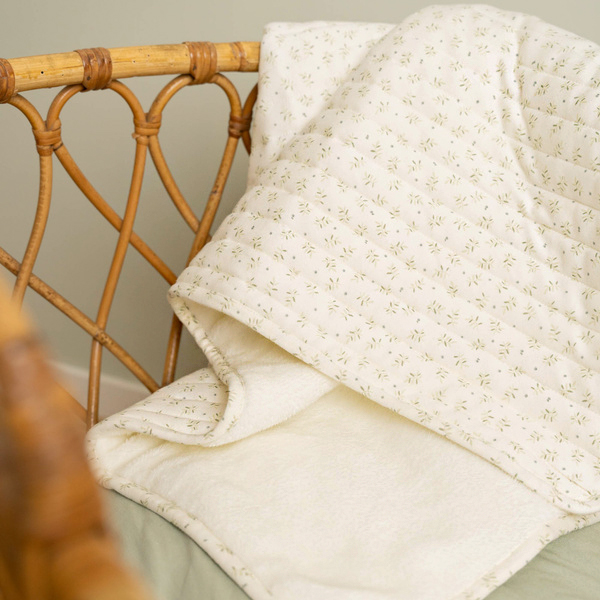 Tu bebé se mantendrá abrigado con esta bonita manta con el estampado de la colección Blueberry Leaves por un lado y un suave y cálido tejido de forro polar por el otro.