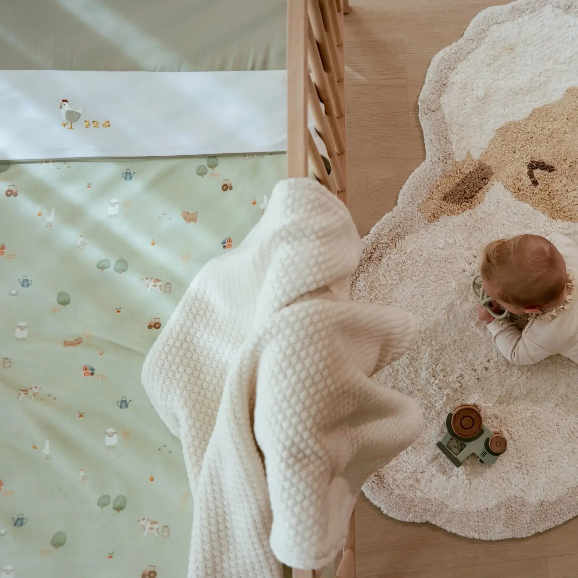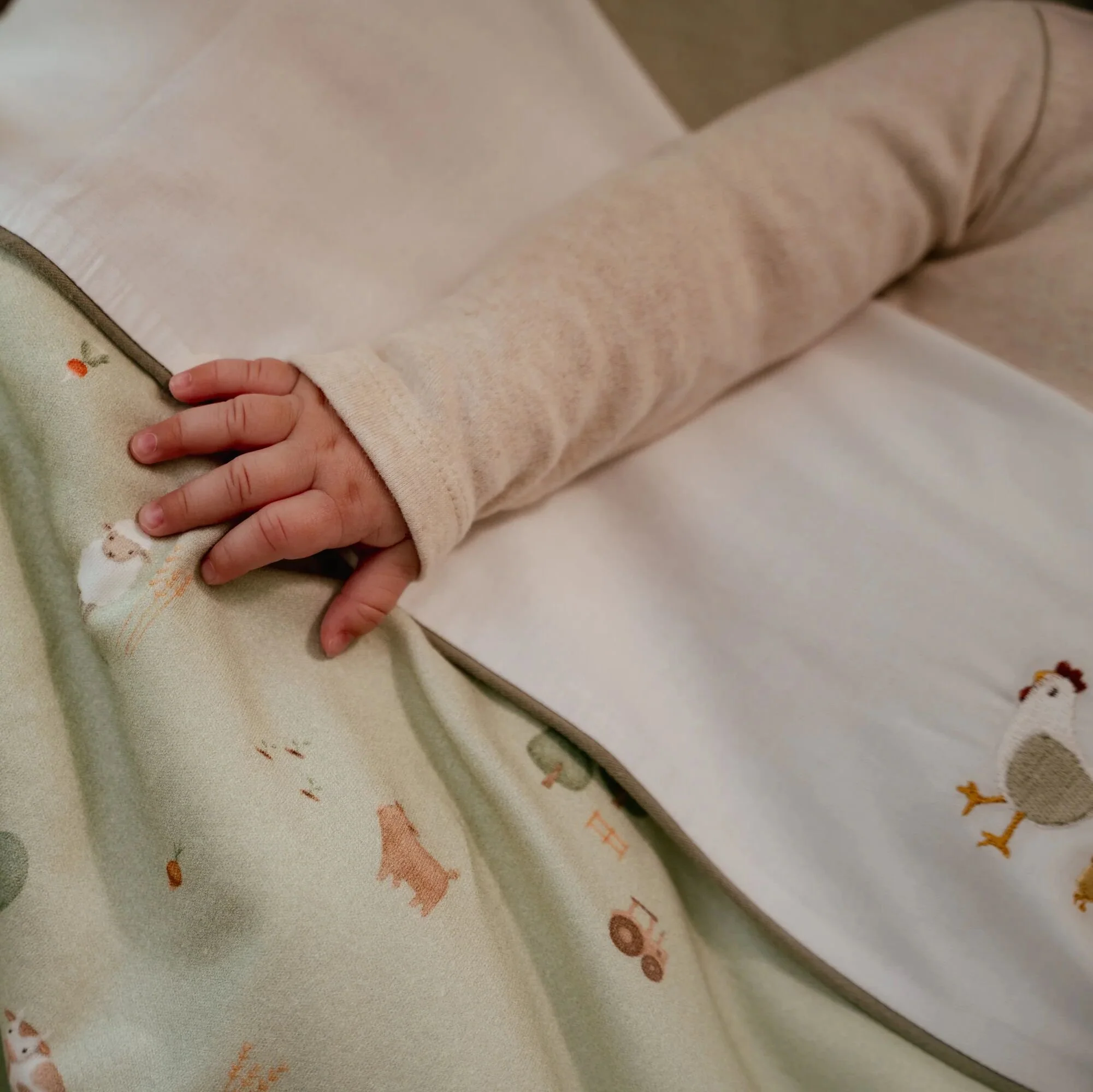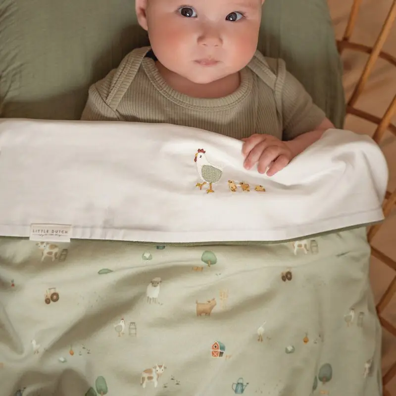 Tu bebé se mantendrá abrigado con esta bonita manta con el divertido estampado de la colección Little Farm por un lado y un suave tejido de peluche por el otro.