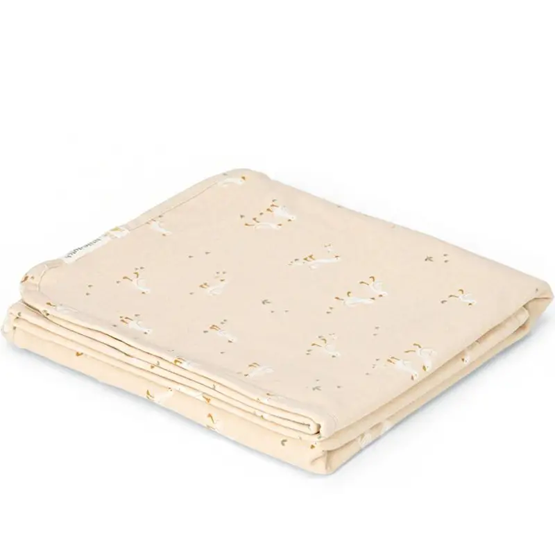 Manta extrasuave con dos estampados, por un lado tiene un adorable estampado de ocas sobre un fondo beige y por el otro lado un estampado de lunas y estrellas en dorado sobre un fondo blanco suave. Fabricada en 100% algodón orgánico, no solo es increíblemente suave, sino también transpirable, perfecta para las noches de primavera/verano.