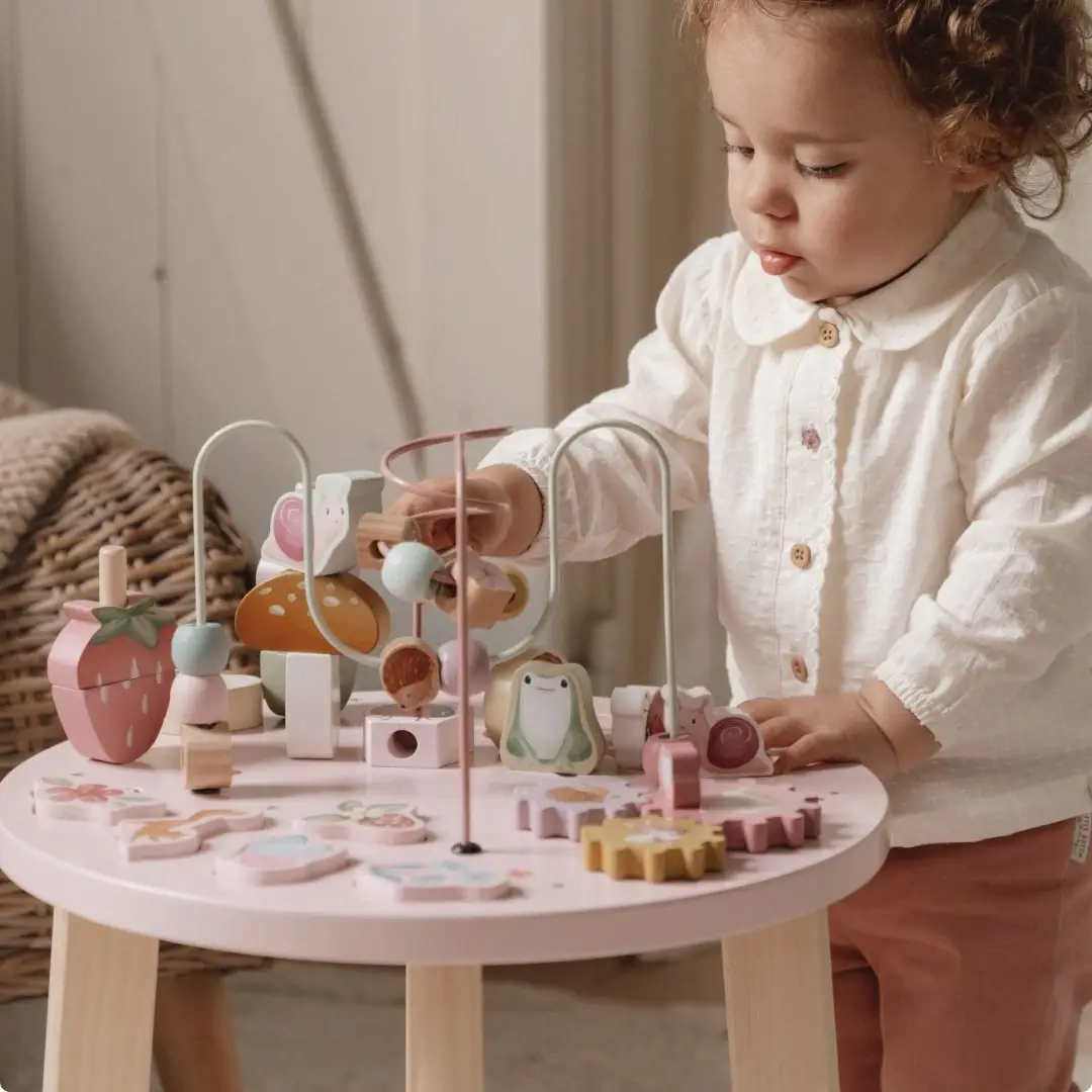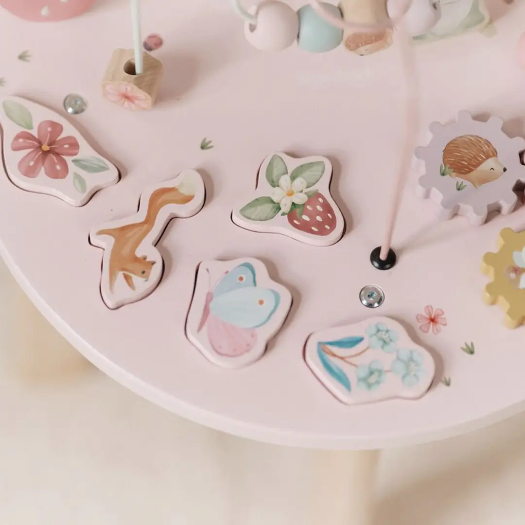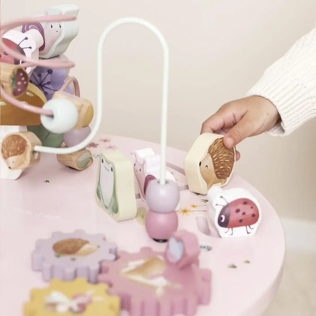 Esta divertida mesa ofrece muchas actividades para explorar, que fomentan el desarrollo de las habilidades motoras finas: mover las cuentas de un lado a otro a lo largo de la espiral, construir torres, completar el rompecabezas, girar los engranajes o mover a la rana, al erizo, a la mariquita y al caracol por el prado de flores. ¡Todo un desafío para los peques!