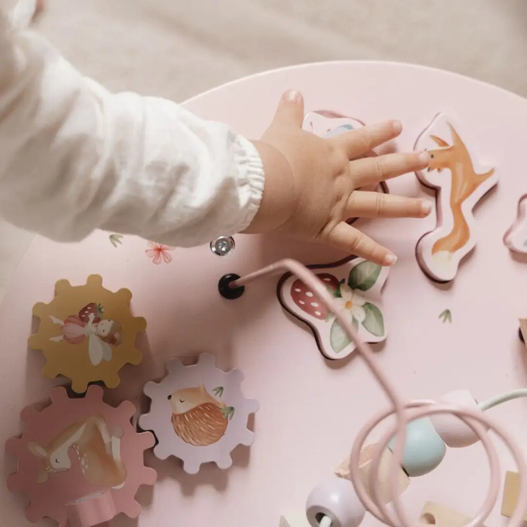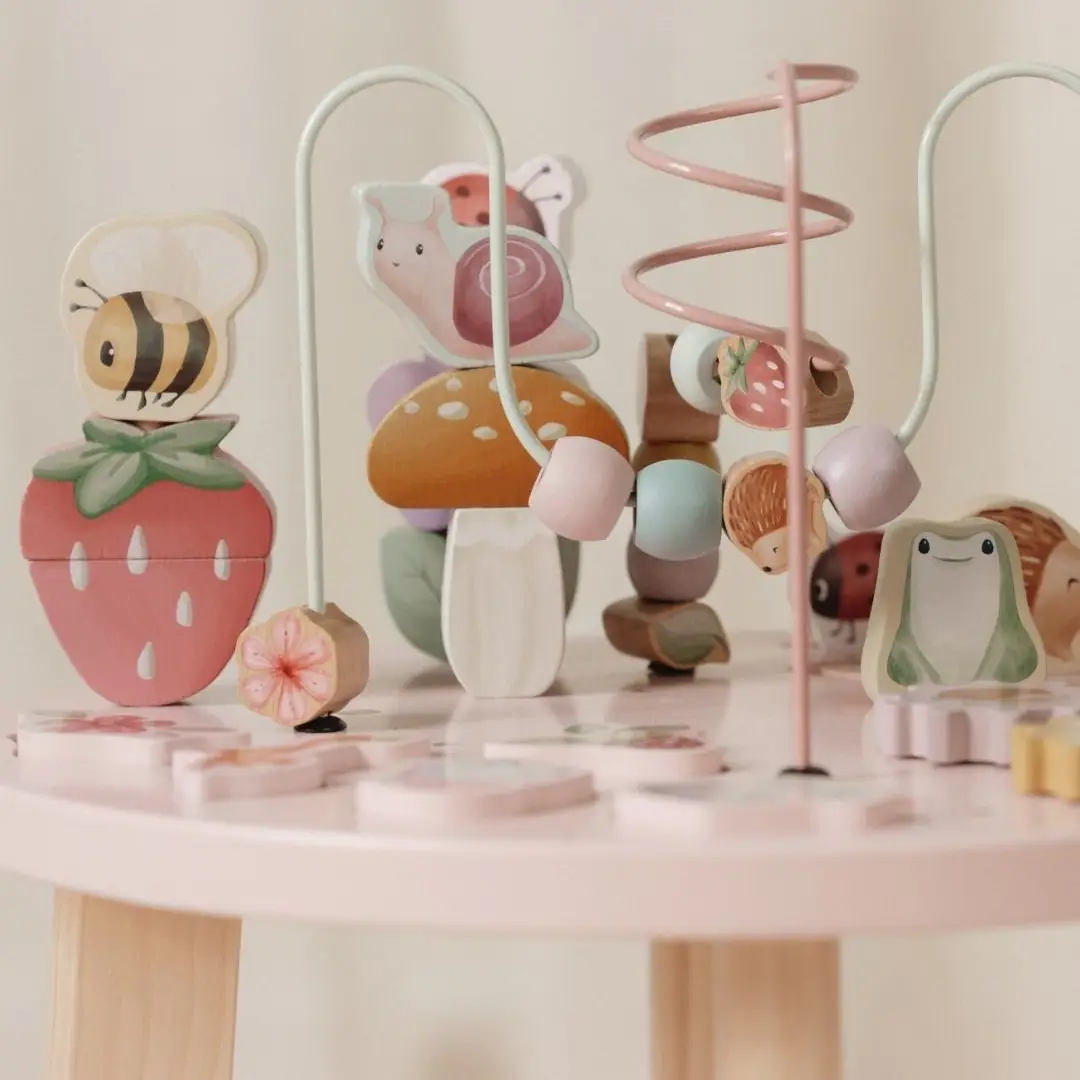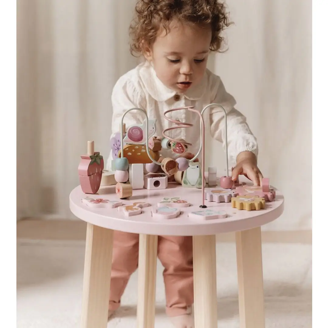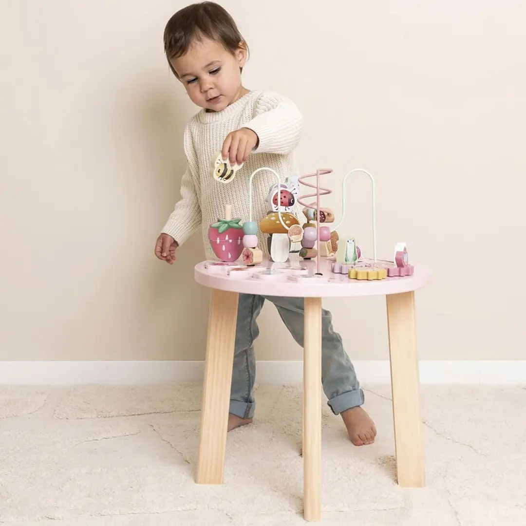 Esta divertida mesa ofrece muchas actividades para explorar, que fomentan el desarrollo de las habilidades motoras finas: mover las cuentas de un lado a otro a lo largo de la espiral, construir torres, completar el rompecabezas, girar los engranajes o mover a la rana, al erizo, a la mariquita y al caracol por el prado de flores. ¡Todo un desafío para los peques!