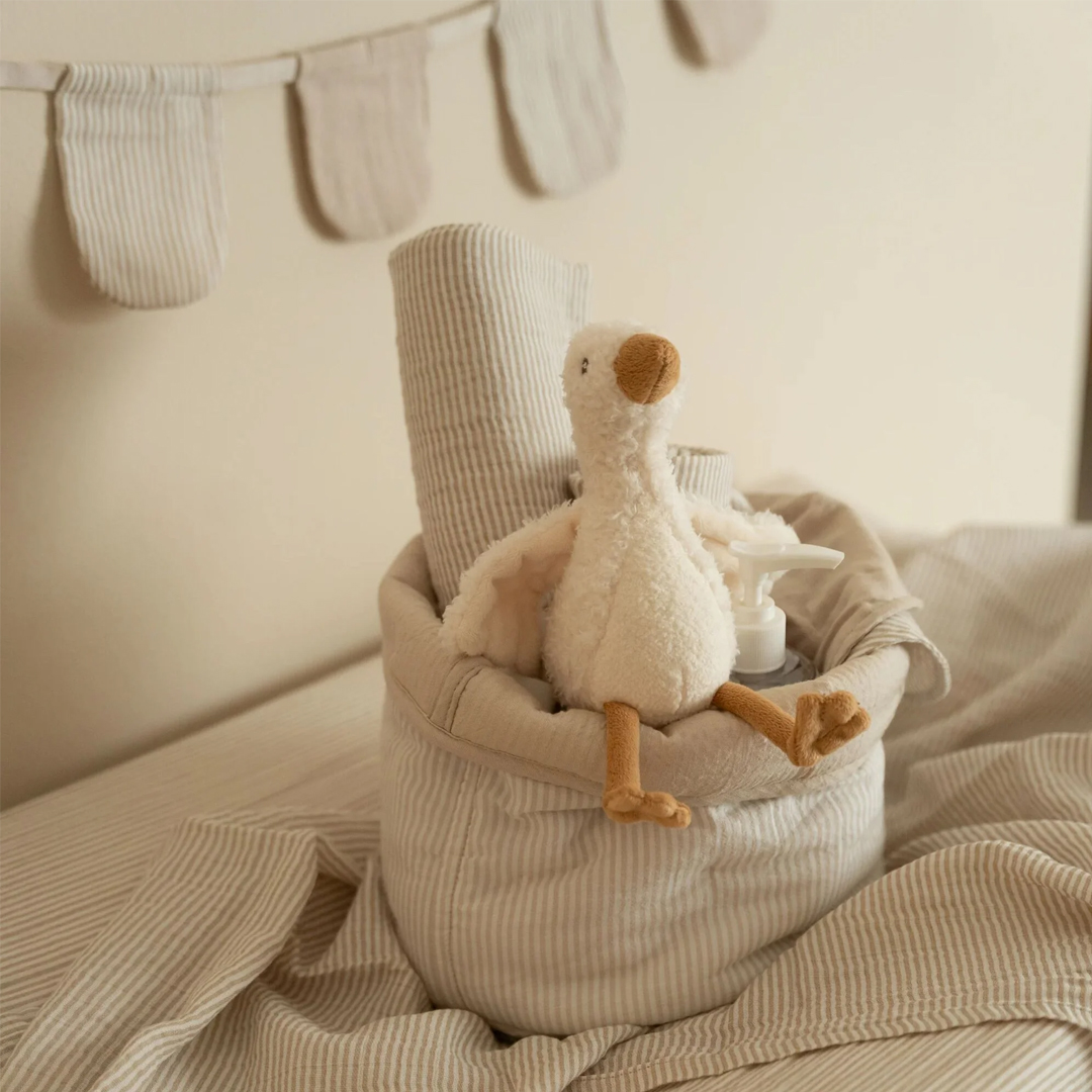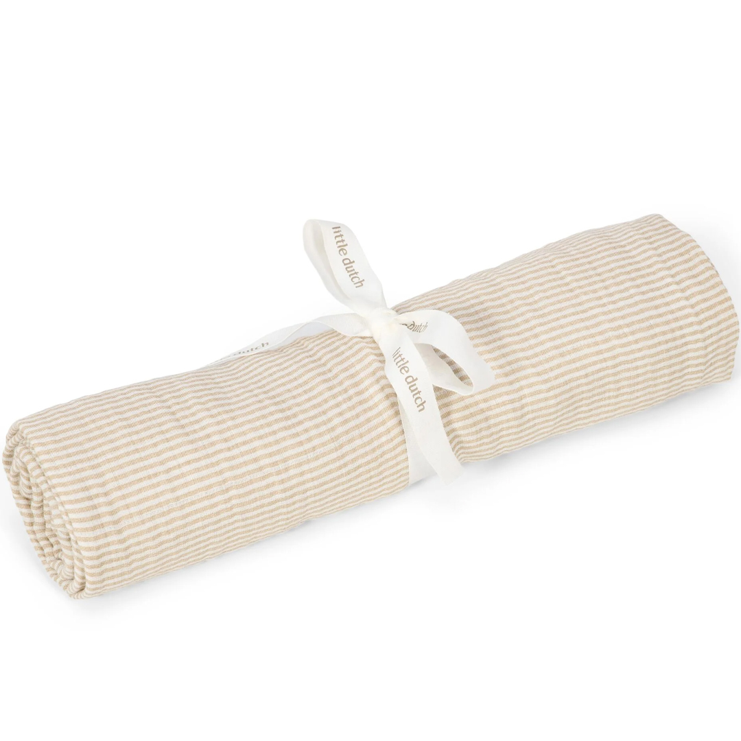 Muselina de algodón con un elegante estampado de rayas. Esta muselina prelavada con un tacto extra suave, una alta capacidad de absorción y un secado rápido es un verdadero imprescindible multifuncional.