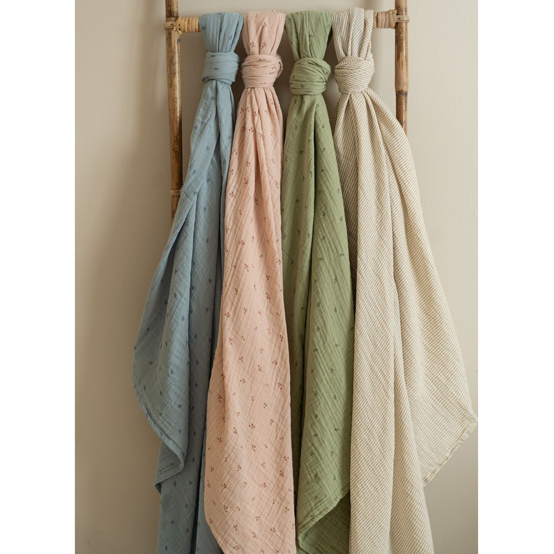 Muselina en color azul con un sutil estampado de hojas. Esta muselina prelavada con un tacto extra suave, una alta capacidad de absorción y un secado rápido es un verdadero imprescindible multifuncional.