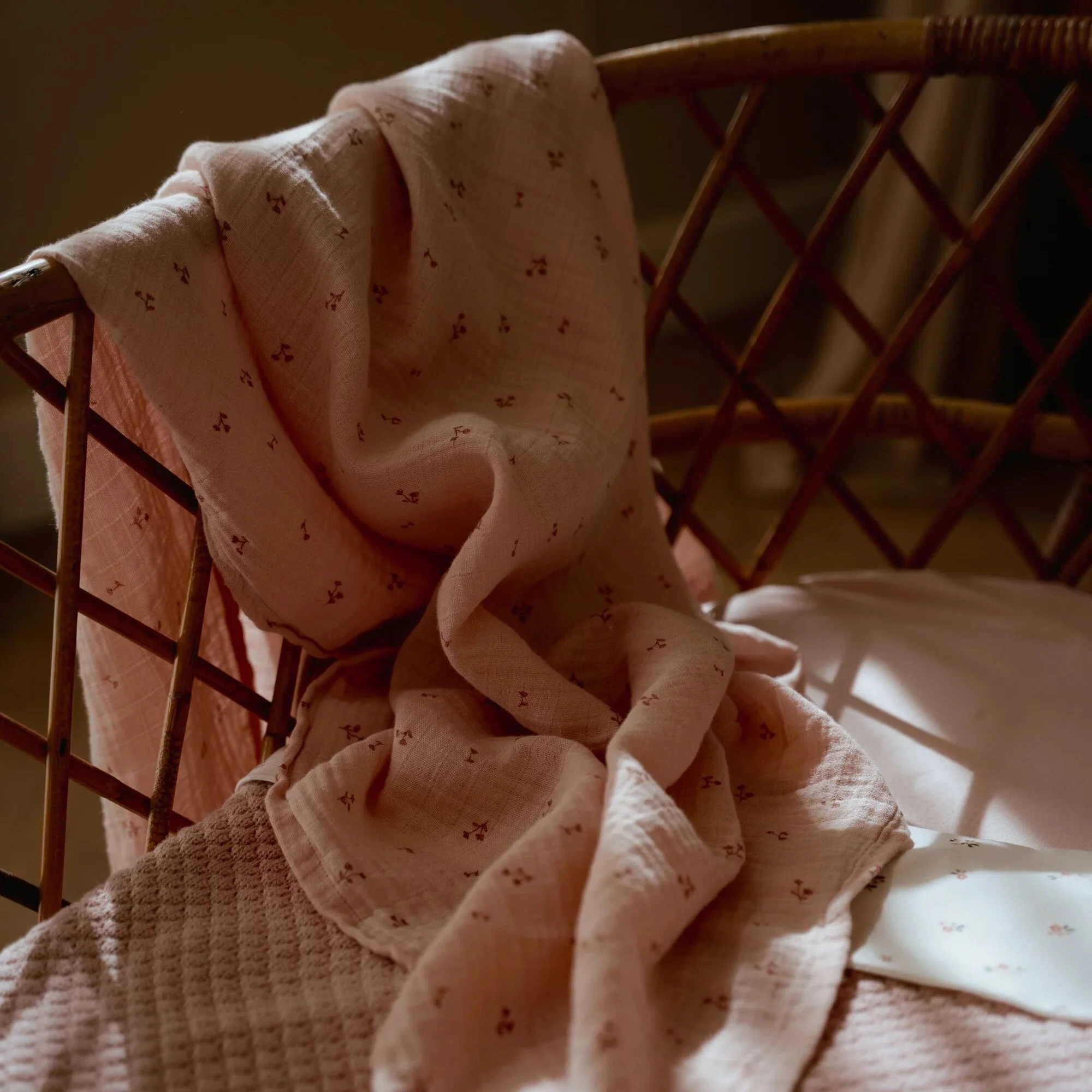 Muselina en color rosa con un sutil estampado de flores. Esta muselina prelavada con un tacto extra suave, una alta capacidad de absorción y un secado rápido es un verdadero imprescindible multifuncional.