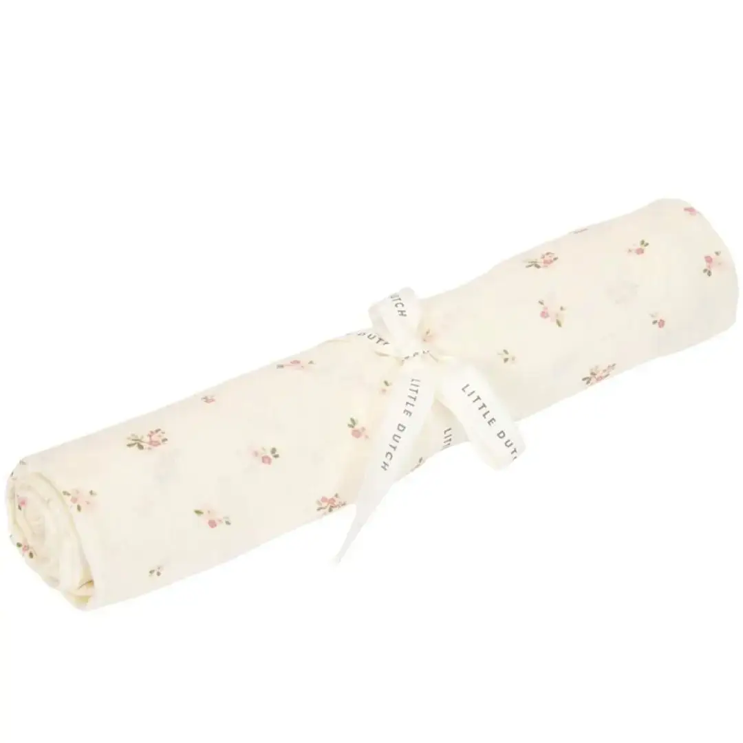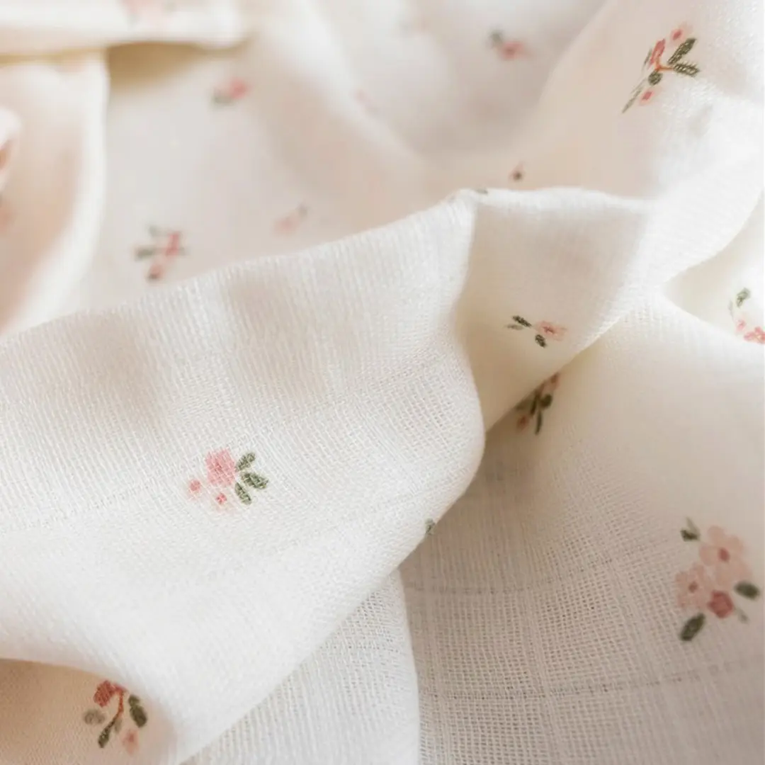 Muselina con un bonito estampado de flores. El tejido de algodón hidrófilo garantiza una gran capacidad de absorción, además tiene un tacto agradable y suave.
