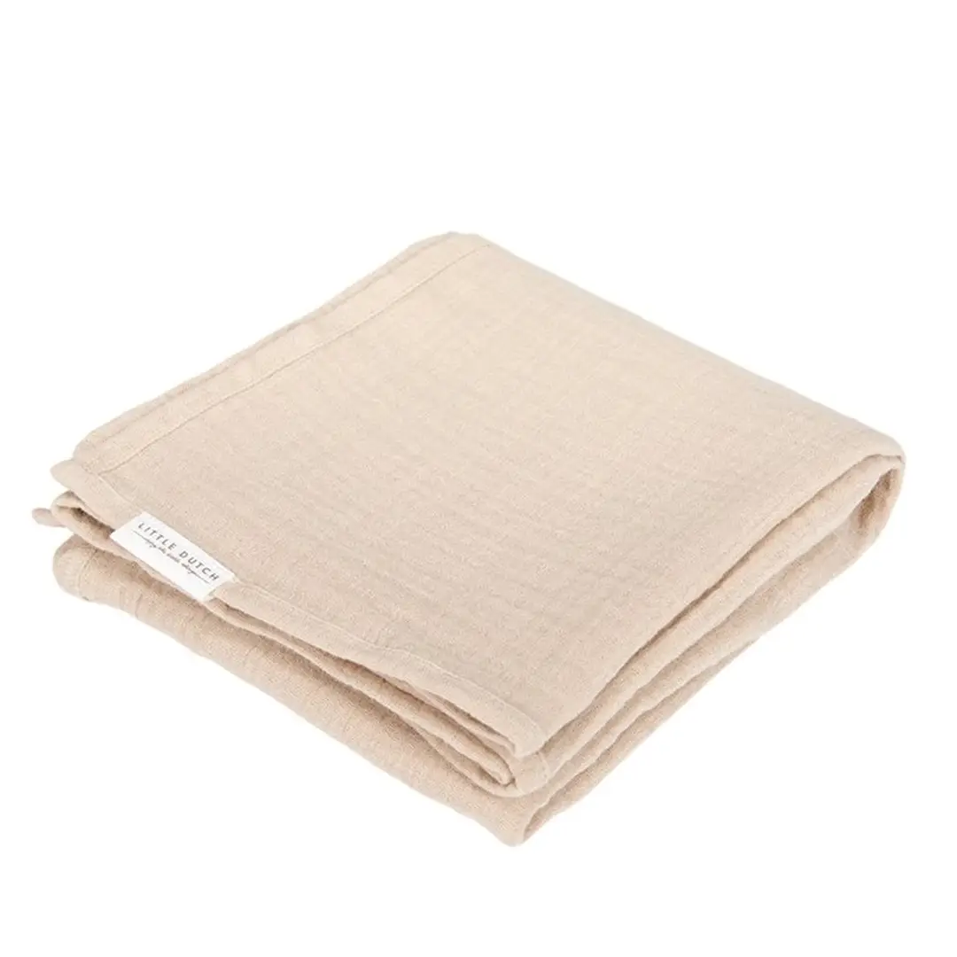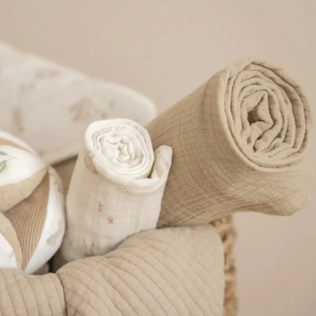 Muselina de color beige. El tejido de algodón hidrófilo garantiza una gran capacidad de absorción, además tiene un tacto agradable y suave.