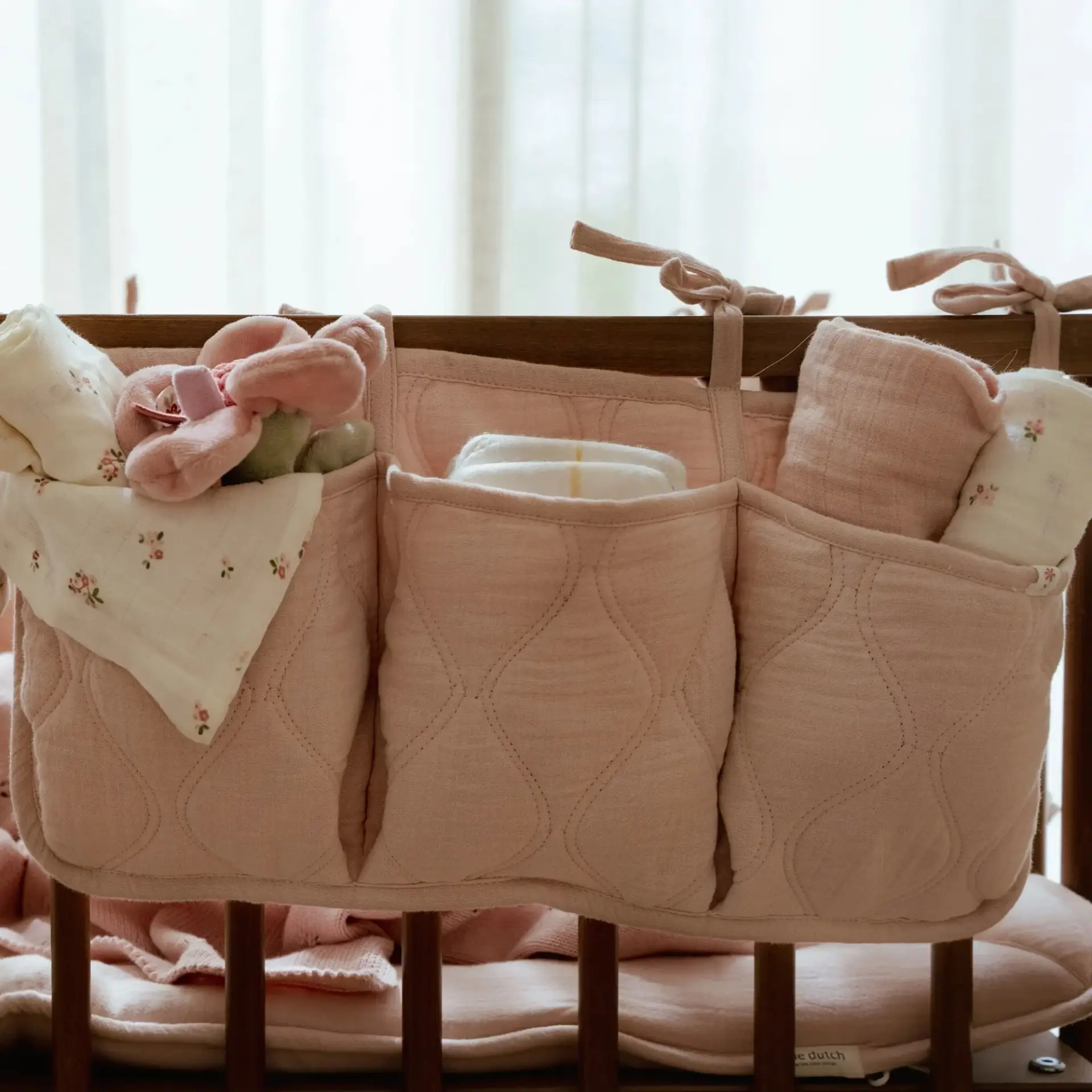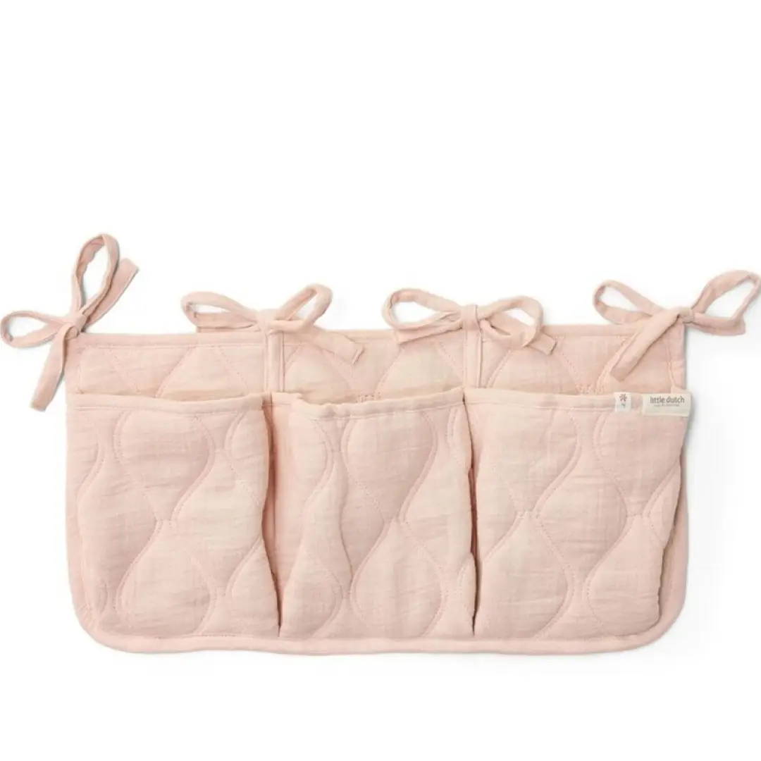 Mantén todos los artículos esenciales del bebé a tu alcance con este práctico organizador. Está fabricado en tejido muselina, prelavada, acolchada y súper suave, 100% algodón orgánico. Tiene tres bolsillos donde puedes almacenar chupetes, toallitas, baberos, pañales…, todo lo que necesitas para cuidar a tu bebé. Puedes fijarlo fácilmente a cualquier sitio con los cordones.