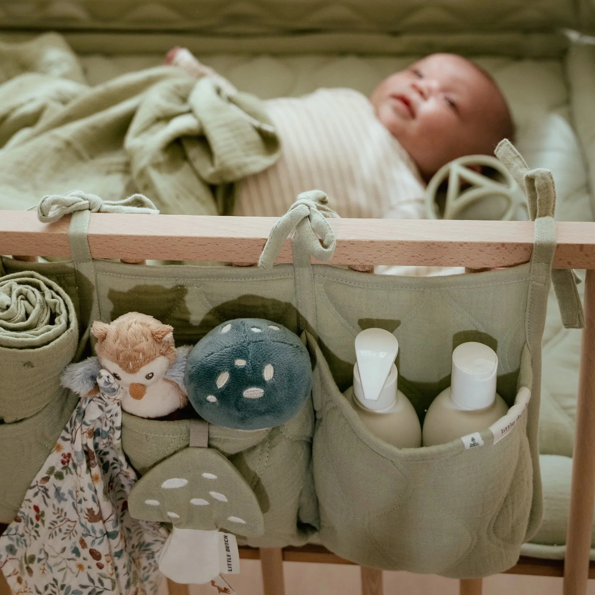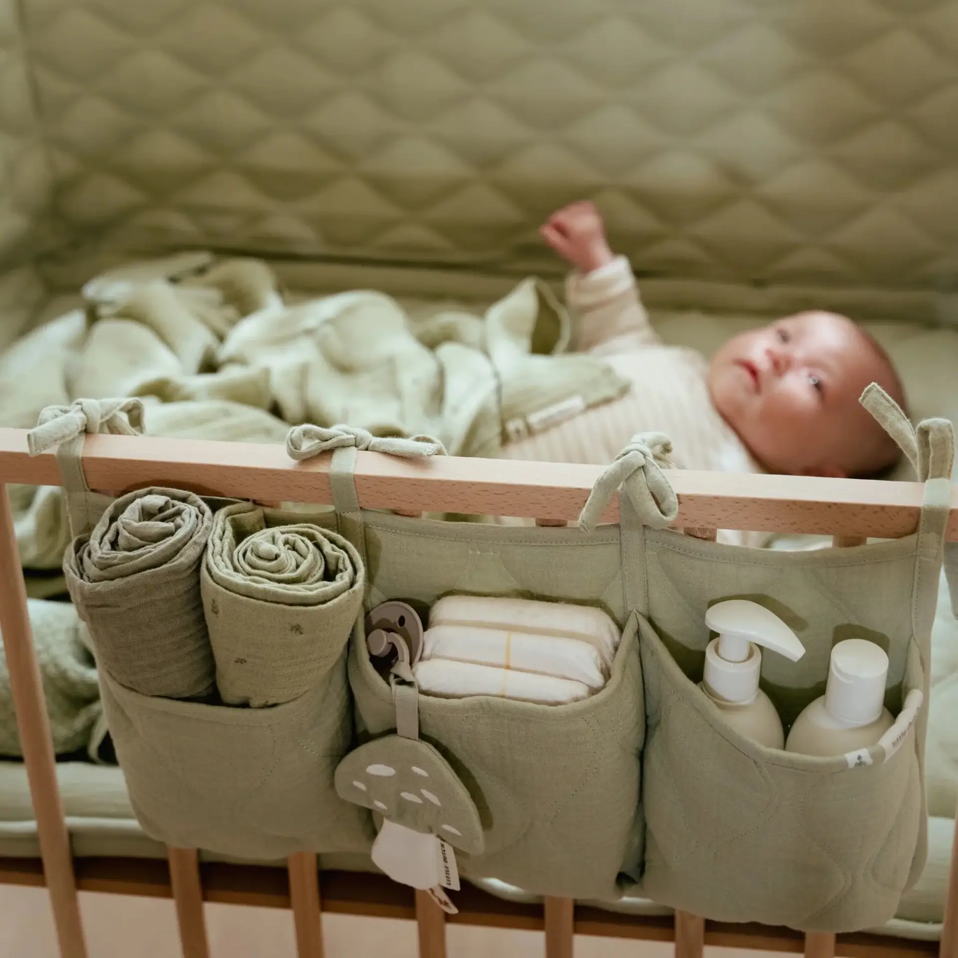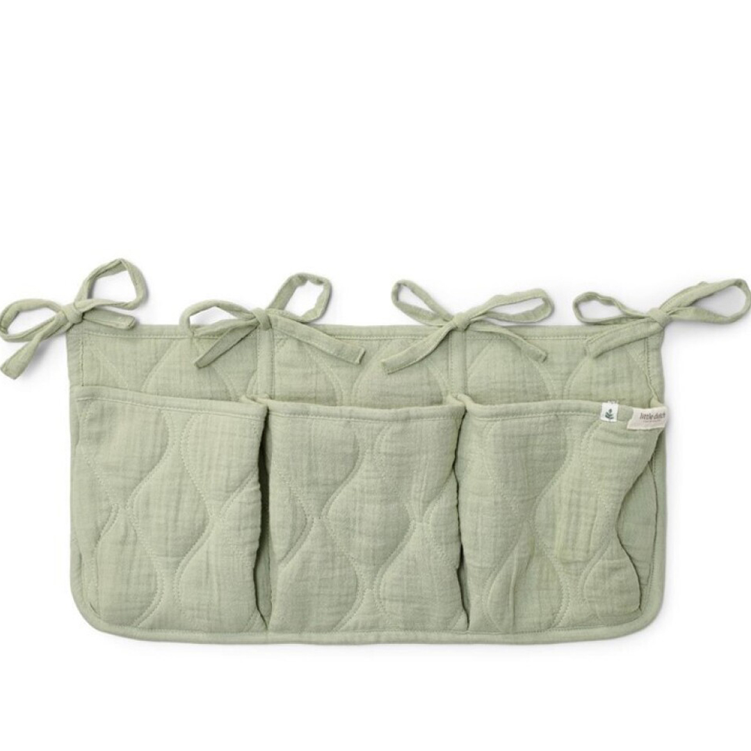 Mantén todos los artículos esenciales del bebé a tu alcance con este práctico organizador. Está fabricado en tejido muselina, prelavada, acolchada y súper suave, 100% algodón orgánico. Tiene tres bolsillos donde puedes almacenar chupetes, toallitas, baberos, pañales…, todo lo que necesitas para cuidar a tu bebé. Puedes fijarlo fácilmente a cualquier sitio con los cordones.