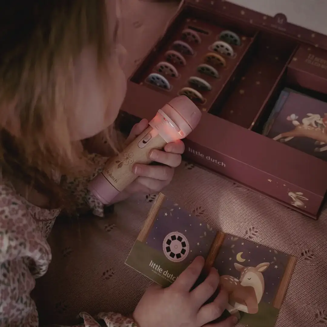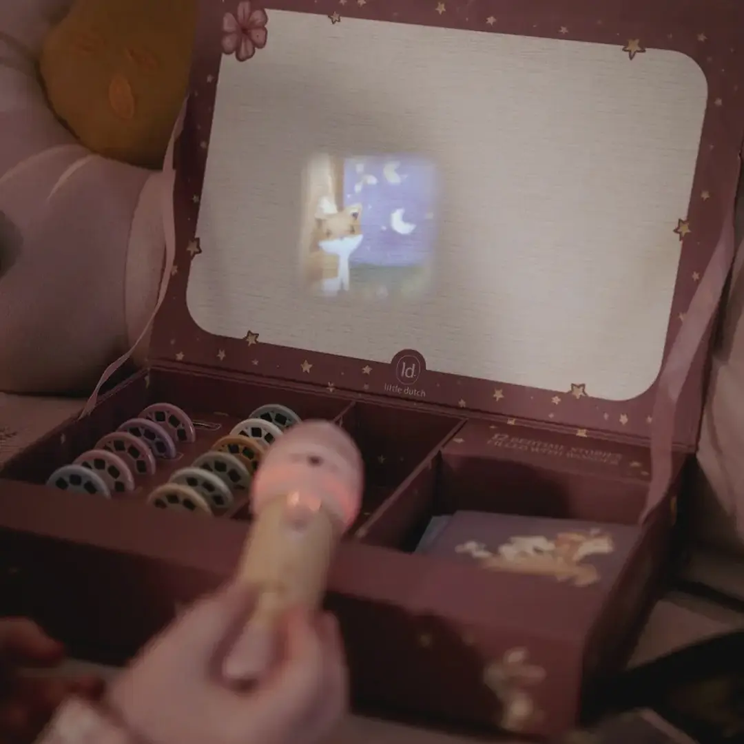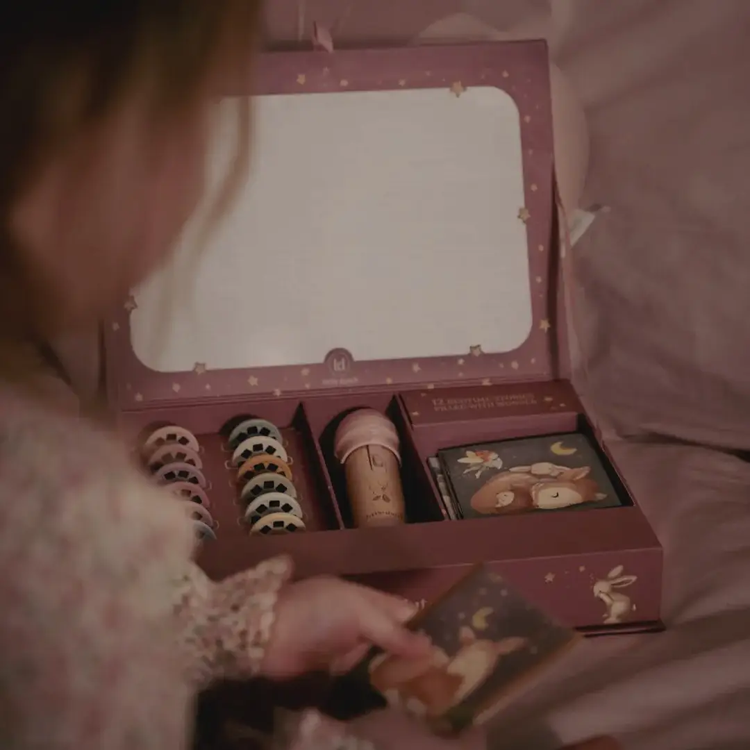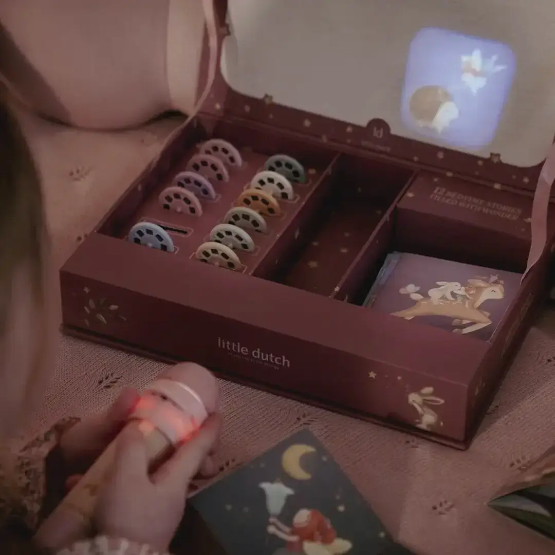 ¡Haz que la magia cobre vida con las historias de esta linterna proyector! Esta cajita contiene una linterna proyector, 12 discos para introducir en la linterna, cada uno con su propia historia que cobra vida a través de hermosas ilustraciones, y 12 bonitos folletos de cada cuento con sus ilustraciones. Puedes proyectar las historias directamente en la caja o en la pared.