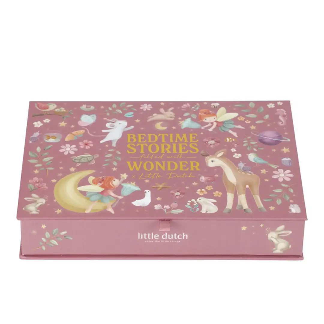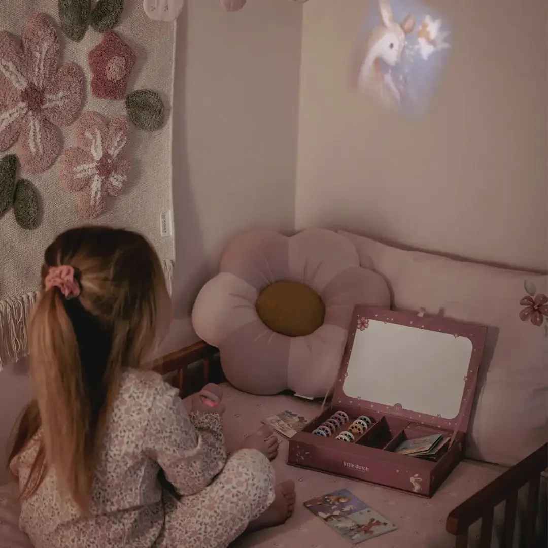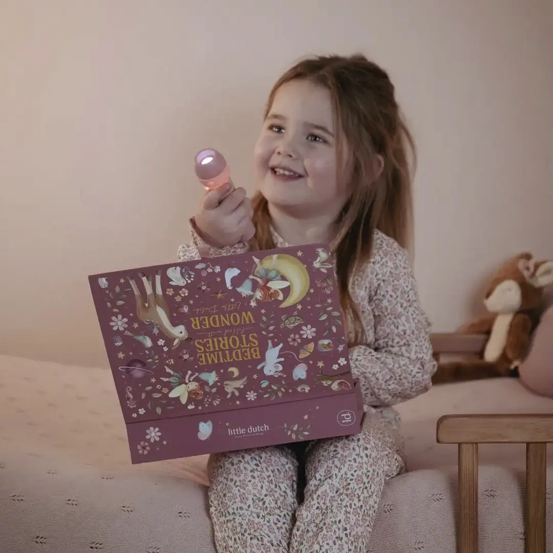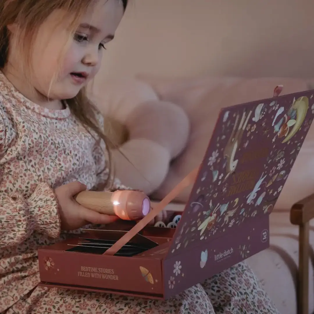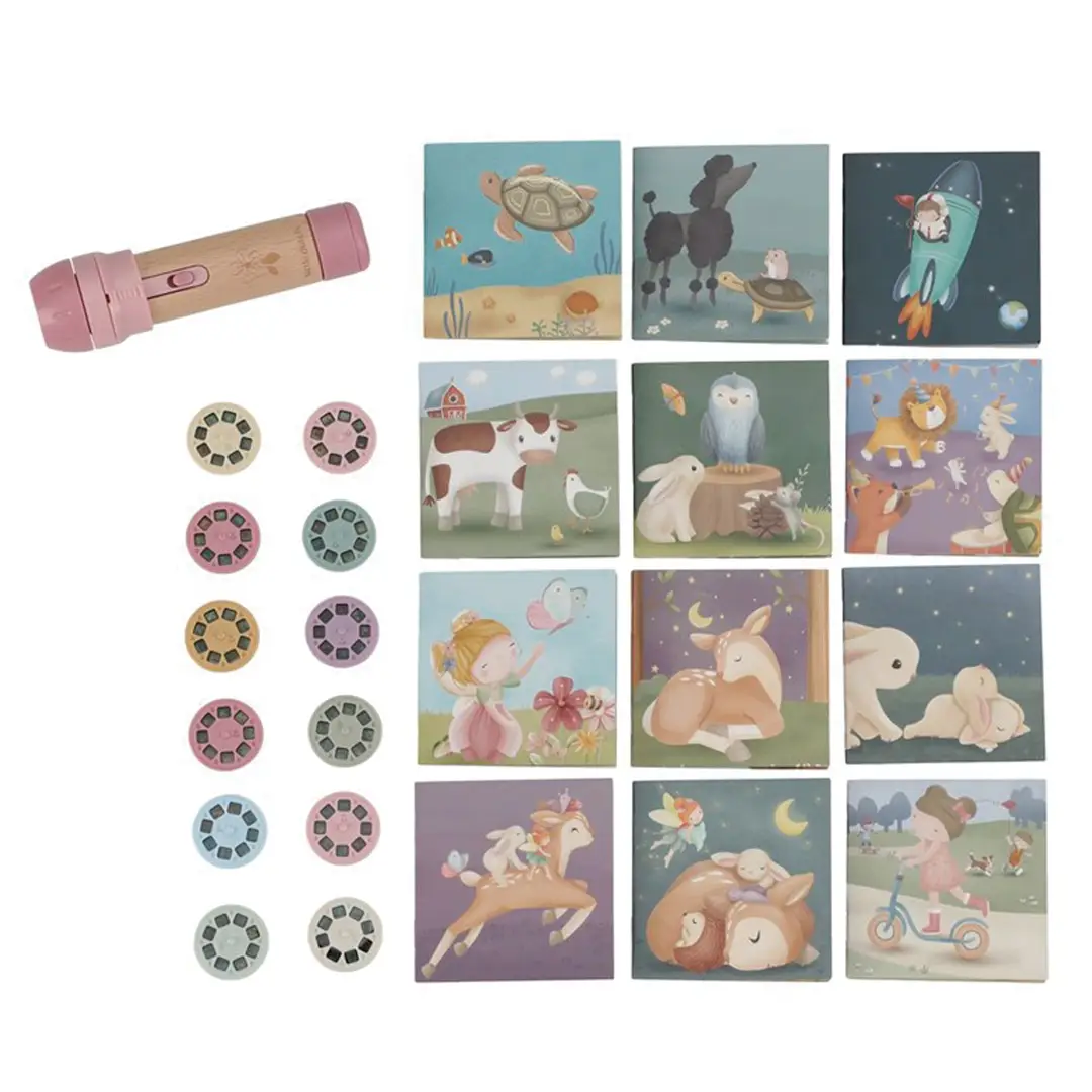 ¡Haz que la magia cobre vida con las historias de esta linterna proyector! Esta cajita contiene una linterna proyector, 12 discos para introducir en la linterna, cada uno con su propia historia que cobra vida a través de hermosas ilustraciones, y 12 bonitos folletos de cada cuento con sus ilustraciones. Puedes proyectar las historias directamente en la caja o en la pared.