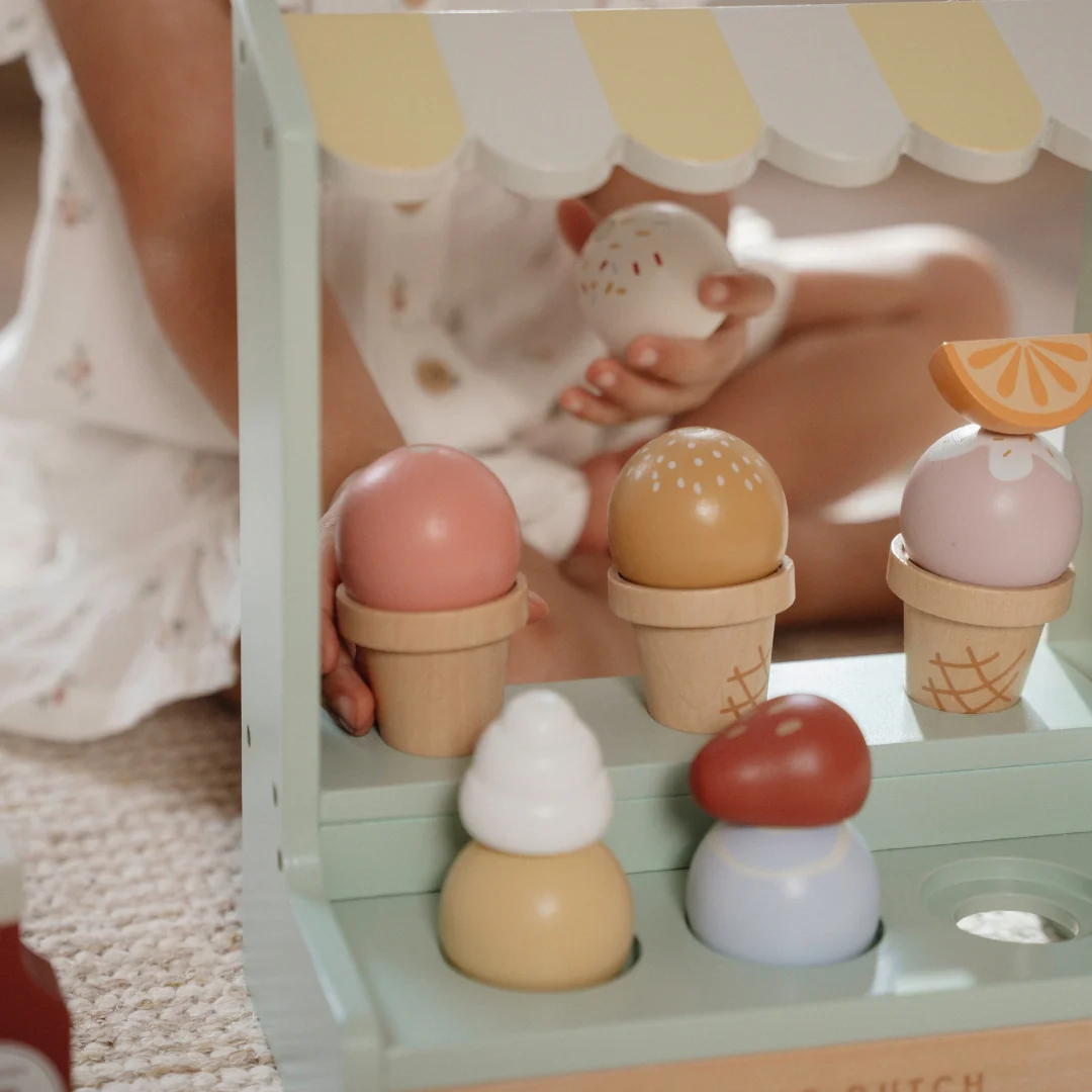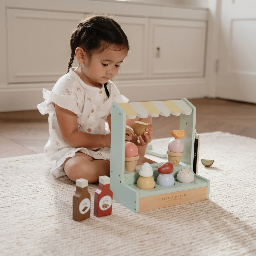 ¿Cuál es tu sabor de helado favorito? ¿Vainilla o fresa? Esta heladería, con su coqueto toldo amarillo y blanco, te invita a probar los seis sabores. Hay tres cucuruchos para llenar con las creaciones más dulces y puedes mejorar la diversión con una variedad de aderezos coloridos. Ya sea atendiendo a clientes imaginarios o jugando al cajero con la lista de precios incluida, este juguete de madera está diseñado para inspirar horas de juego imaginativo.