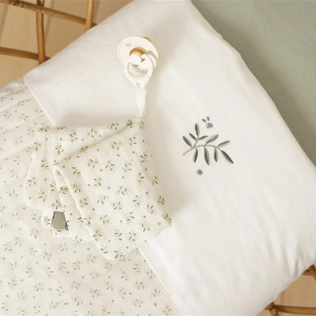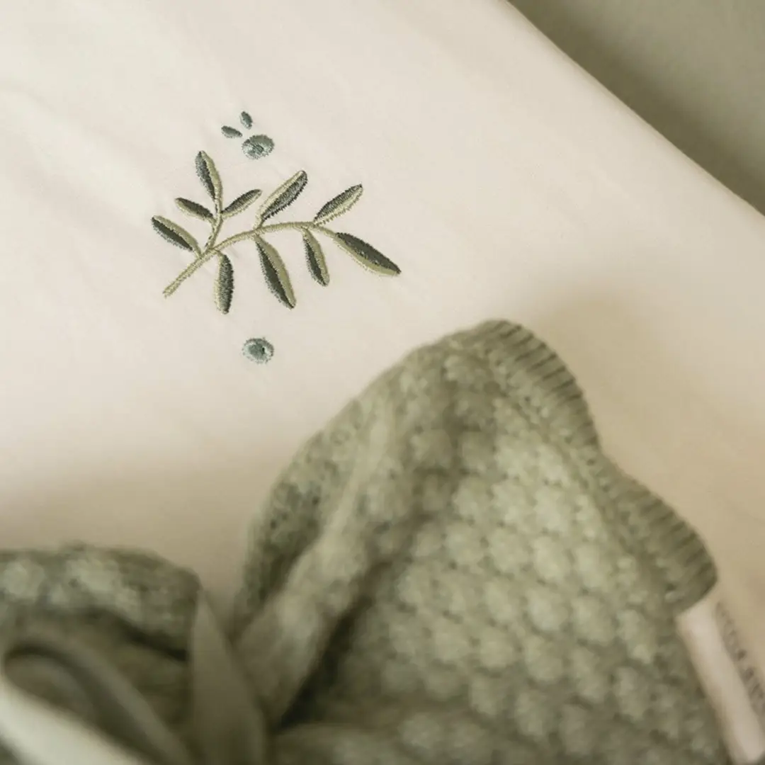 Sábana encimera con un bonito bordado de hojas de arándano en la solapa. El bebé dormirá maravillosamente gracias al tejido de algodón suave, agradable y flexible.