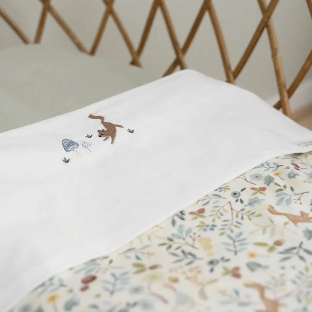 Sábana encimera con un divertido bordado de una ardilla y setas en la solapa. El bebé dormirá maravillosamente gracias al tejido de algodón suave, agradable y flexible.