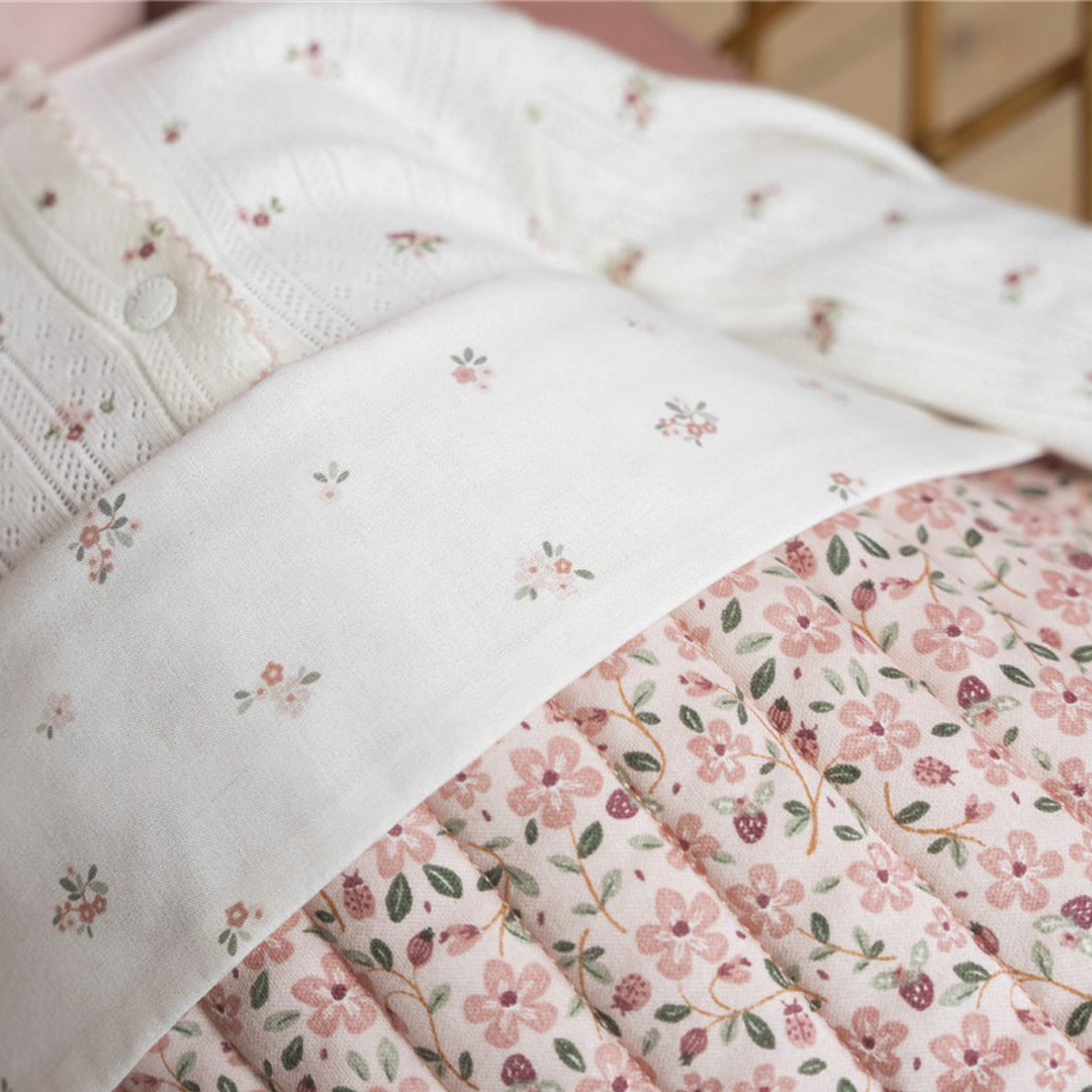 Sábana encimera con un delicado estampado de flores en la solapa. El bebé dormirá maravillosamente gracias al tejido de algodón suave, agradable y flexible.