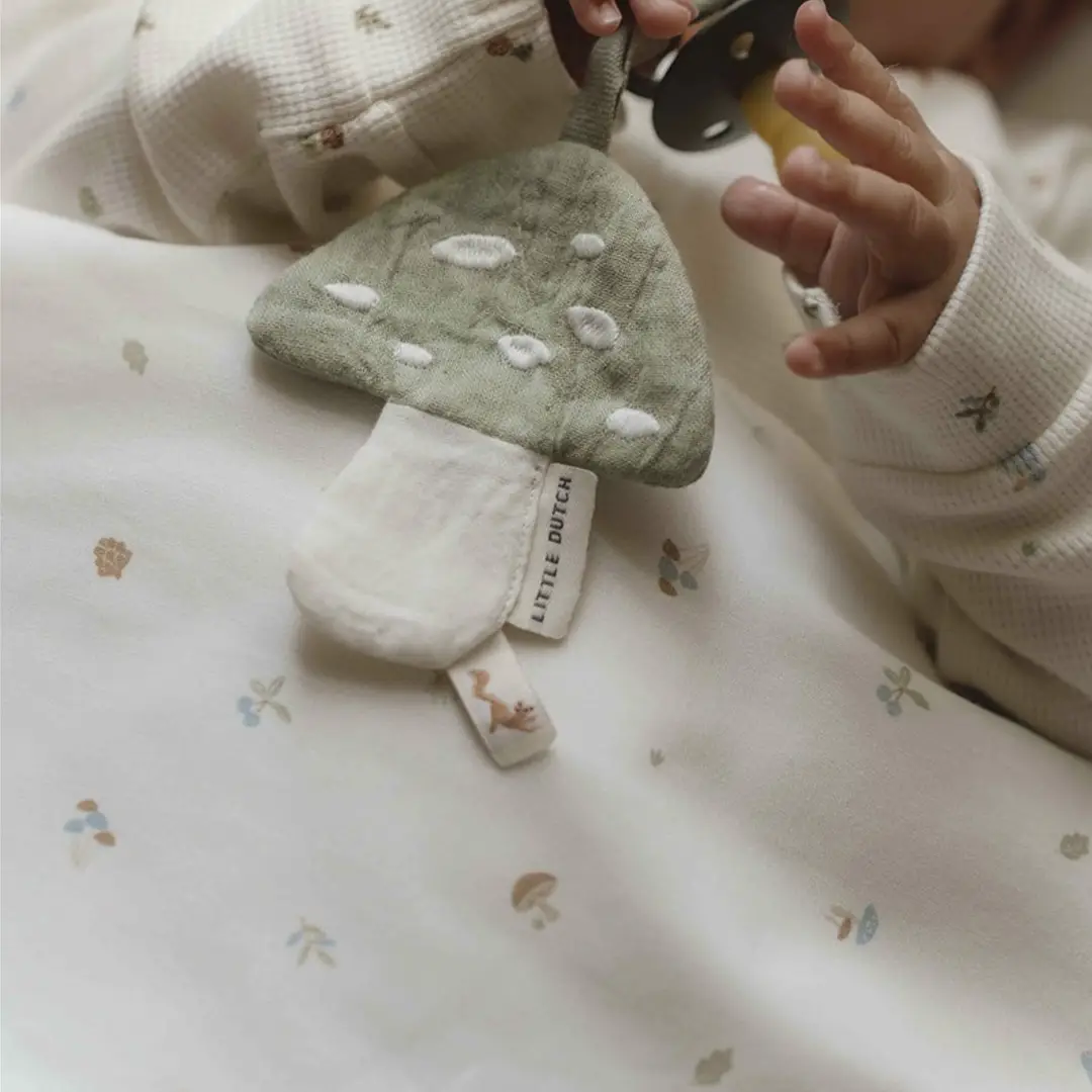 Sábana encimera con un bonito estampado de setas, hojas, bellotas y piñas en la solapa. El bebé dormirá maravillosamente gracias al tejido de algodón suave, agradable y flexible.