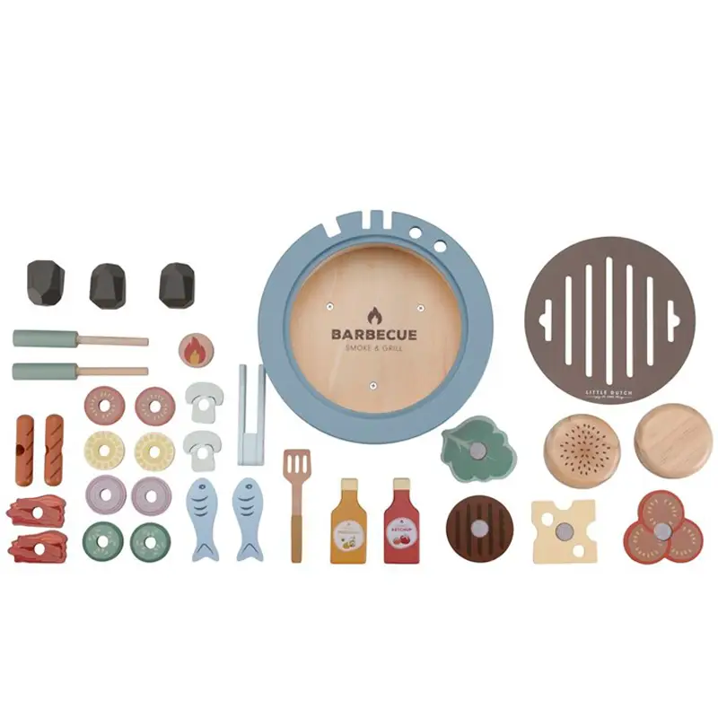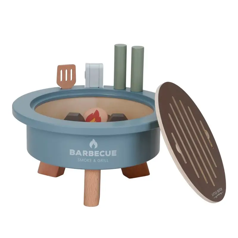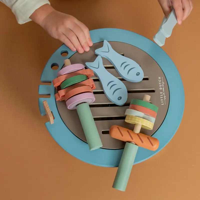 Los peques tendrán todo lo necesario para imitar una auténtica fiesta de barbacoa: una pinza, una espátula y dos brochetas, verduras y proteínas, una deliciosa hamburguesa con el panecillo y las capas apilables, salsa de tomate y mostaza, y para mayor realismo, una parrilla extraíble para llenar con trozos de carbón y simular el proceso de calentar la barbacoa.