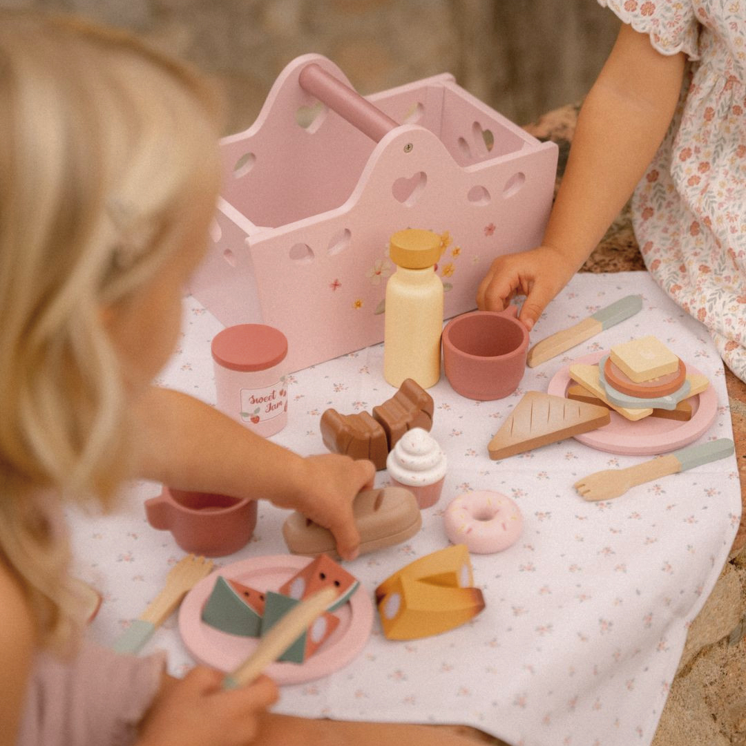 Todo lo necesario para recrear un apetecible picnic al aire libre está en esta encantadora cesta de picnic: apilables para hacer un delicioso sándwich con queso, tomate y lechuga, baguette, frutas que se pueden cortar con el cuchillo de madera y volver a unir con el velcro, zumo y mermelada con tapas que se pueden abrir y cerrar, dulces y helado y, por supuesto, tazas, platos, cubiertos y un mantel para servir la merienda.