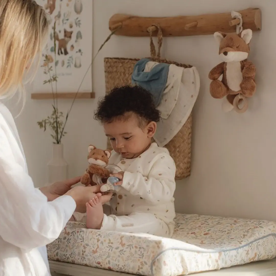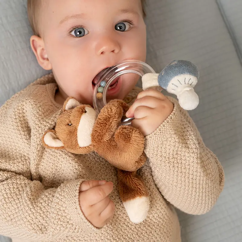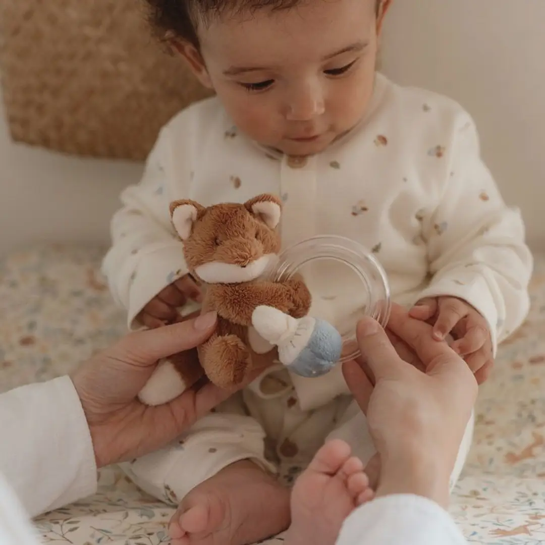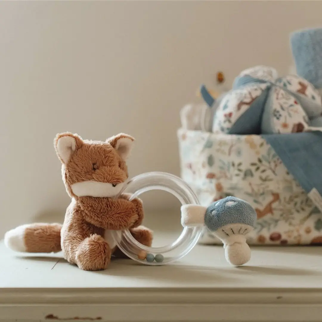 Adorable sonajero con un simpático zorro, una pequeña seta y con anillo para sujetarlo. Emite un sonido agradable al moverlo ya que el anillo contiene tres pequeñas cuentas.