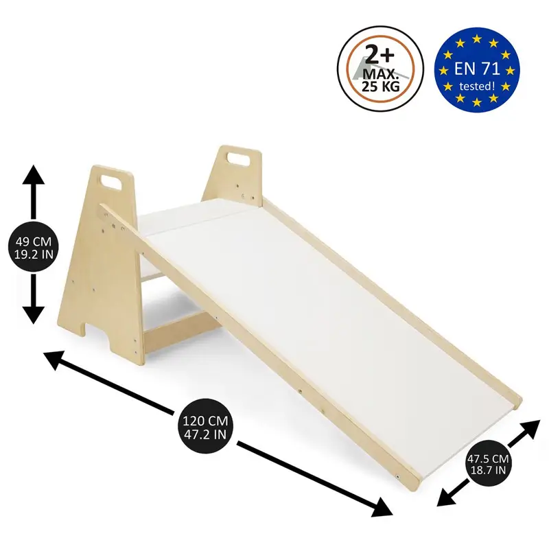 El tobogán es un elemento muy divertido para que los peques disfruten de su tiempo de juego mientras ejercitan su cuerpo subiendo y bajando escalones. Las aberturas de agarre en los 2 lados de la escalera apoyan el equilibrio y los estabilizan al subir y bajar. Además, se proporcionan pegatinas antideslizantes 3M para los escalones para asegurar aún más la estabilidad durante el juego y el uso. El tobogán soporta un peso de hasta 25 kg.