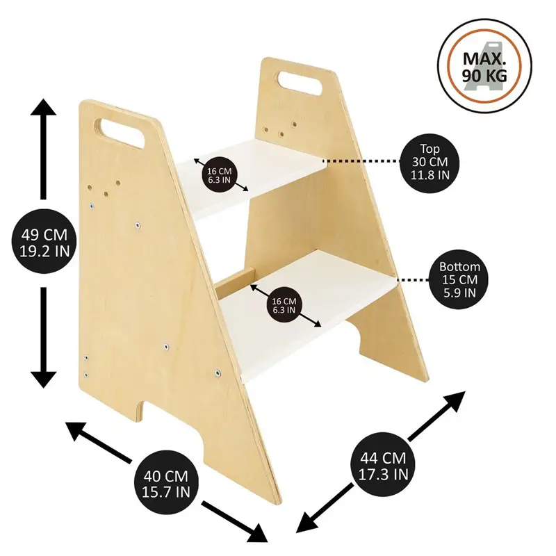 También puedes utilizar la escalera de 2 niveles de forma independiente desatornillando la tabla deslizante, puede usarse como una torre de aprendizaje que permite a los niños lavarse las manos o cepillarse los dientes en el baño. La escalera soporta un peso de hasta 90 kg.
