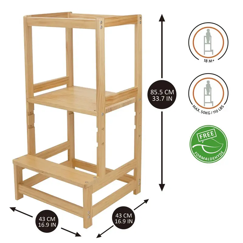 Torre de aprendizaje fabricada en madera de pino. La estructura tiene tres posiciones de altura y está pensada para crecer a medida que lo hace el niño/a, soporta un peso máximo de 50 kgs.