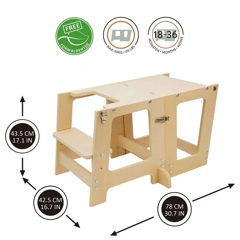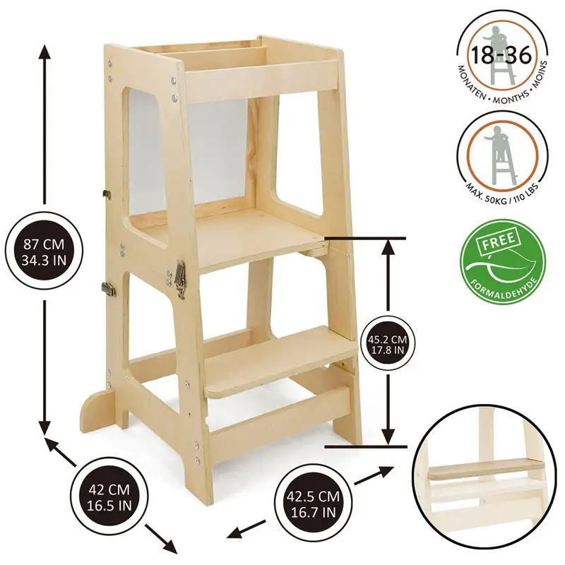 Torre de aprendizaje 3 en 1. Como torre de aprendizaje es perfecta para desarrollar habilidades manipulativas, destreza al tocar y agarrar, desarrollar la coordinación mano-ojo… Cuenta con un peldaño de seguridad ajustable en altura a 16’5 cm o 22’5 cm del suelo, las patas traseras tienen unos extensores para aumentar la estabilidad y soporta un peso máximo de 50 kgs. También puede usarse como torre con pizarra ya que contiene una divertida pizarra con doble funcionalidad: por un lado es magnética para escribir con rotuladores y utilizar juguetes magnéticos y por el otro lado es una pizarra tradicional de tiza. Y además, también puede convertirse en mesa con asiento ya que tiene dos cierres metálicos que permiten transformar, de forma muy sencilla, la torre en una práctica mesa.