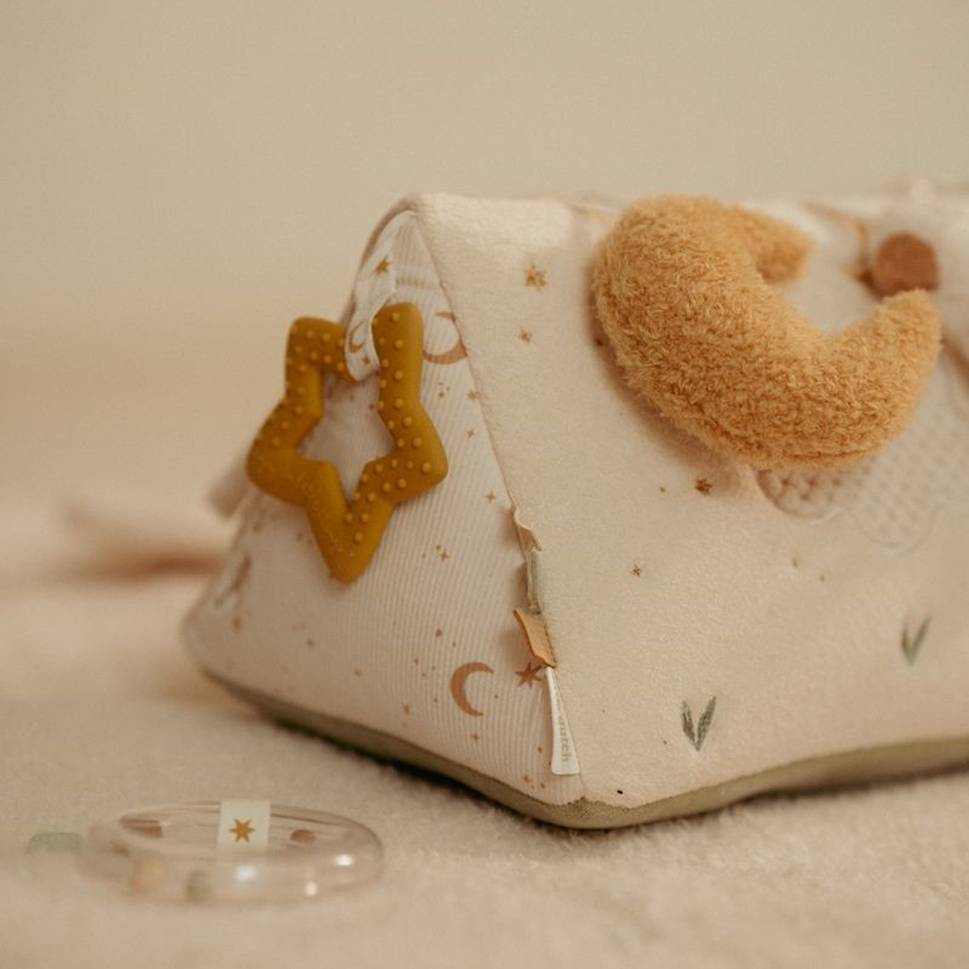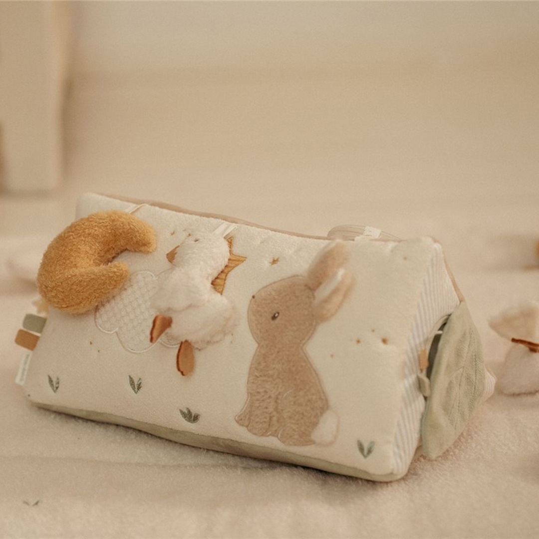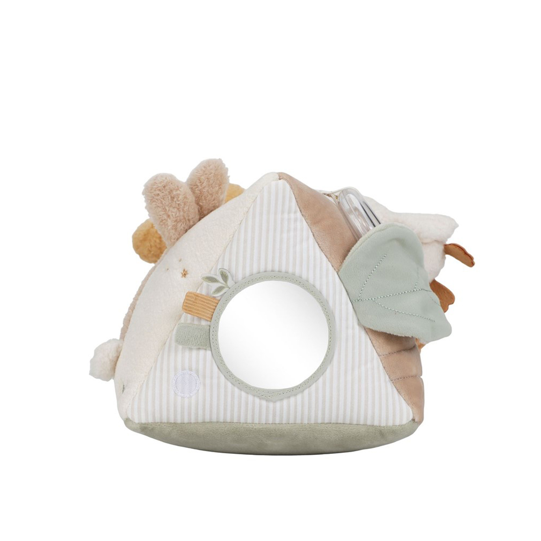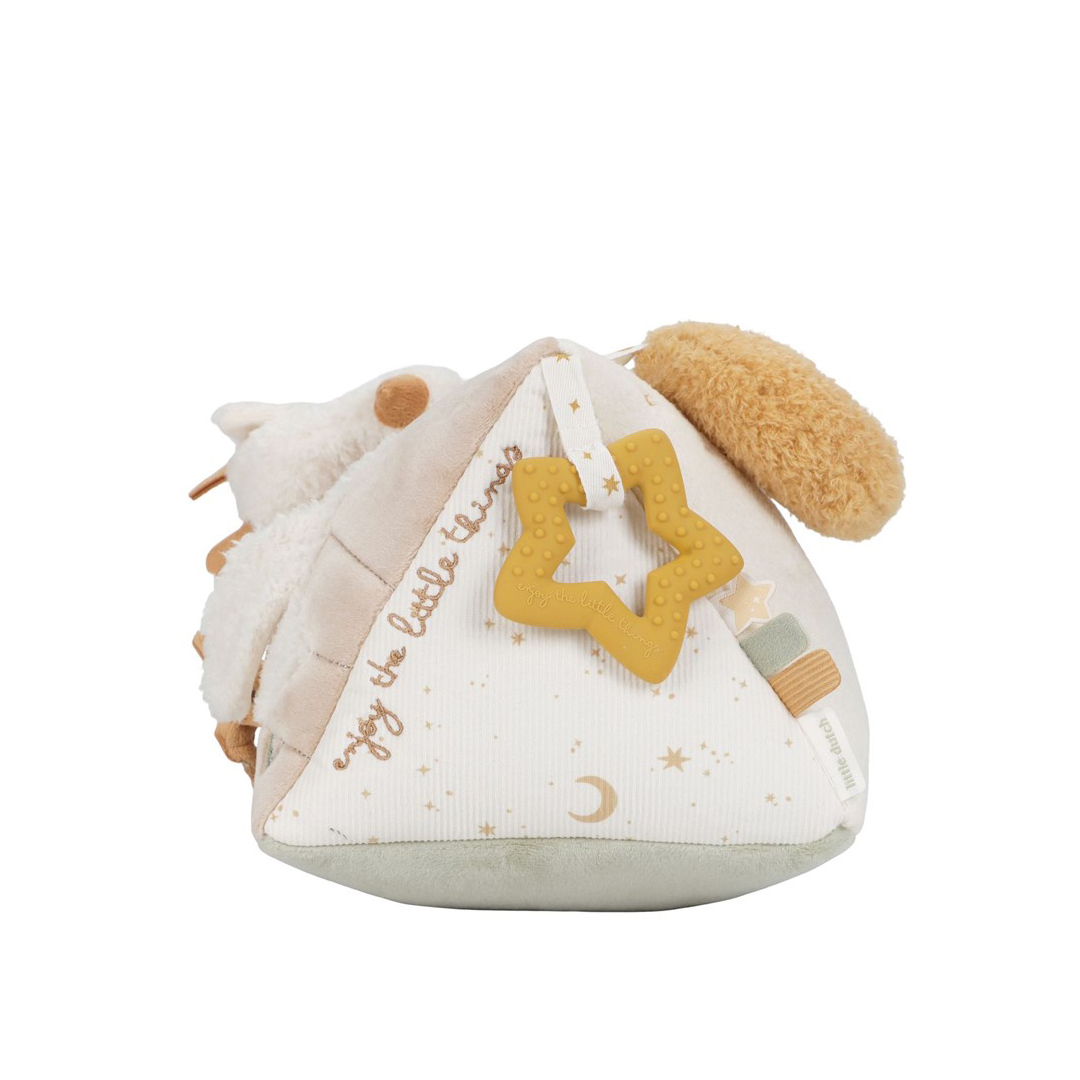 Divertido triángulo, muy suave y blandito, con un montón de actividades para explorar que despertarán la curiosidad del bebé. Hay mucho por descubrir ya que cada lado presenta diferentes texturas, formas, colores y actividades que estimularán su desarrollo sensorial. Las actividades no solo estimulan los sentidos, sino que también favorecen el desarrollo de la coordinación mano-ojo del bebé.