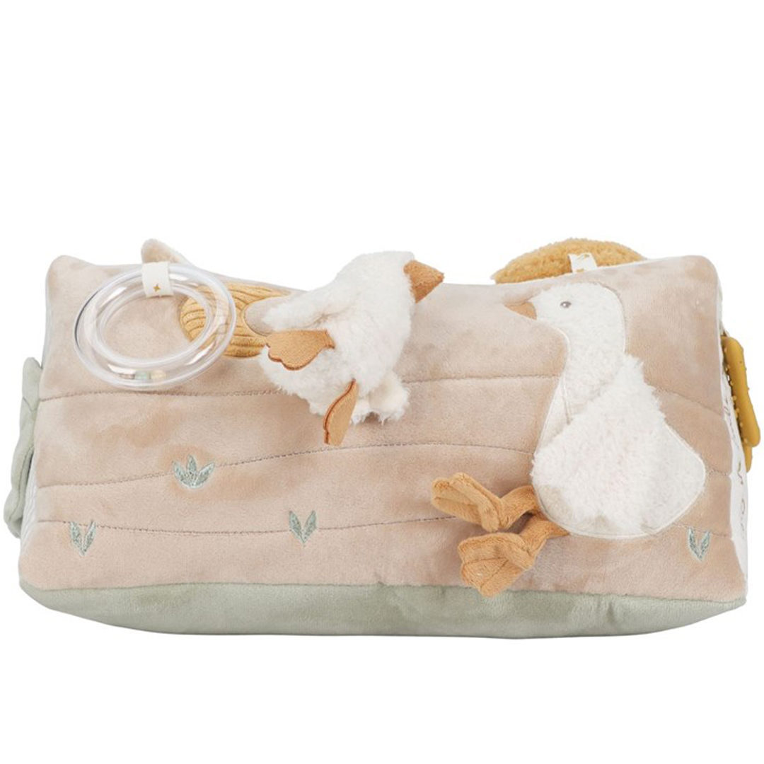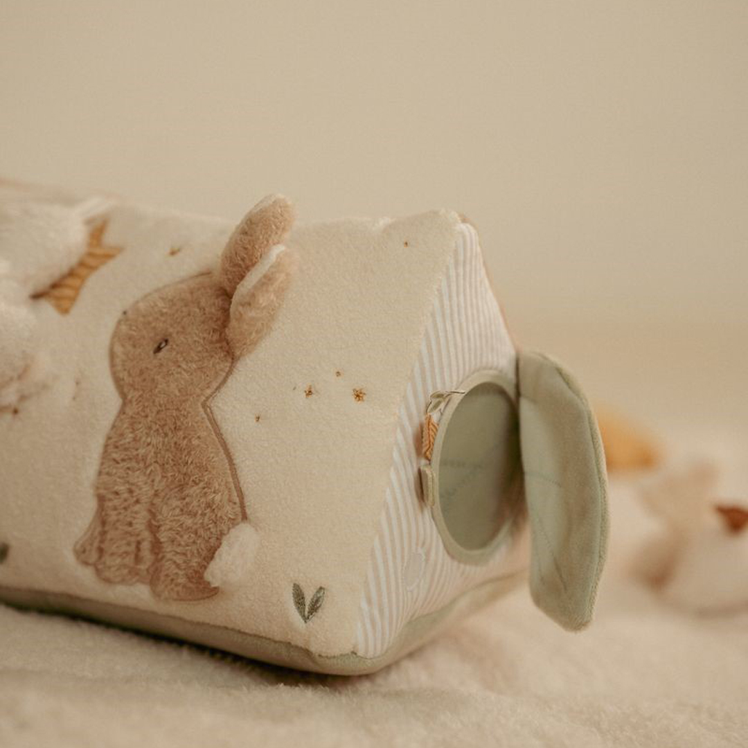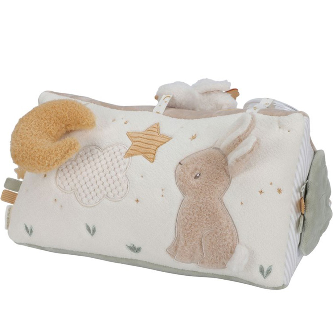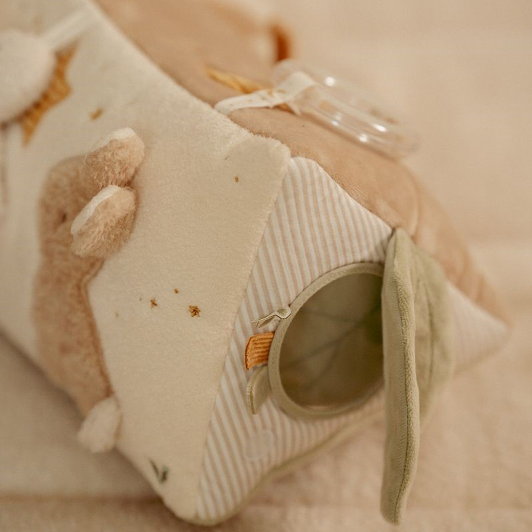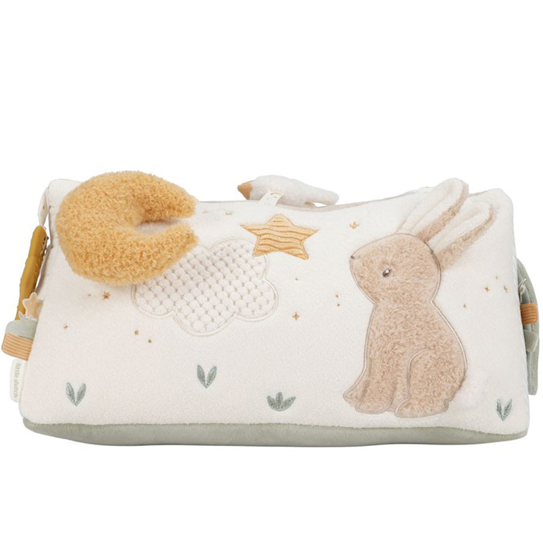 Divertido triángulo, muy suave y blandito, con un montón de actividades para explorar que despertarán la curiosidad del bebé. Hay mucho por descubrir ya que cada lado presenta diferentes texturas, formas, colores y actividades que estimularán su desarrollo sensorial. Las actividades no solo estimulan los sentidos, sino que también favorecen el desarrollo de la coordinación mano-ojo del bebé.